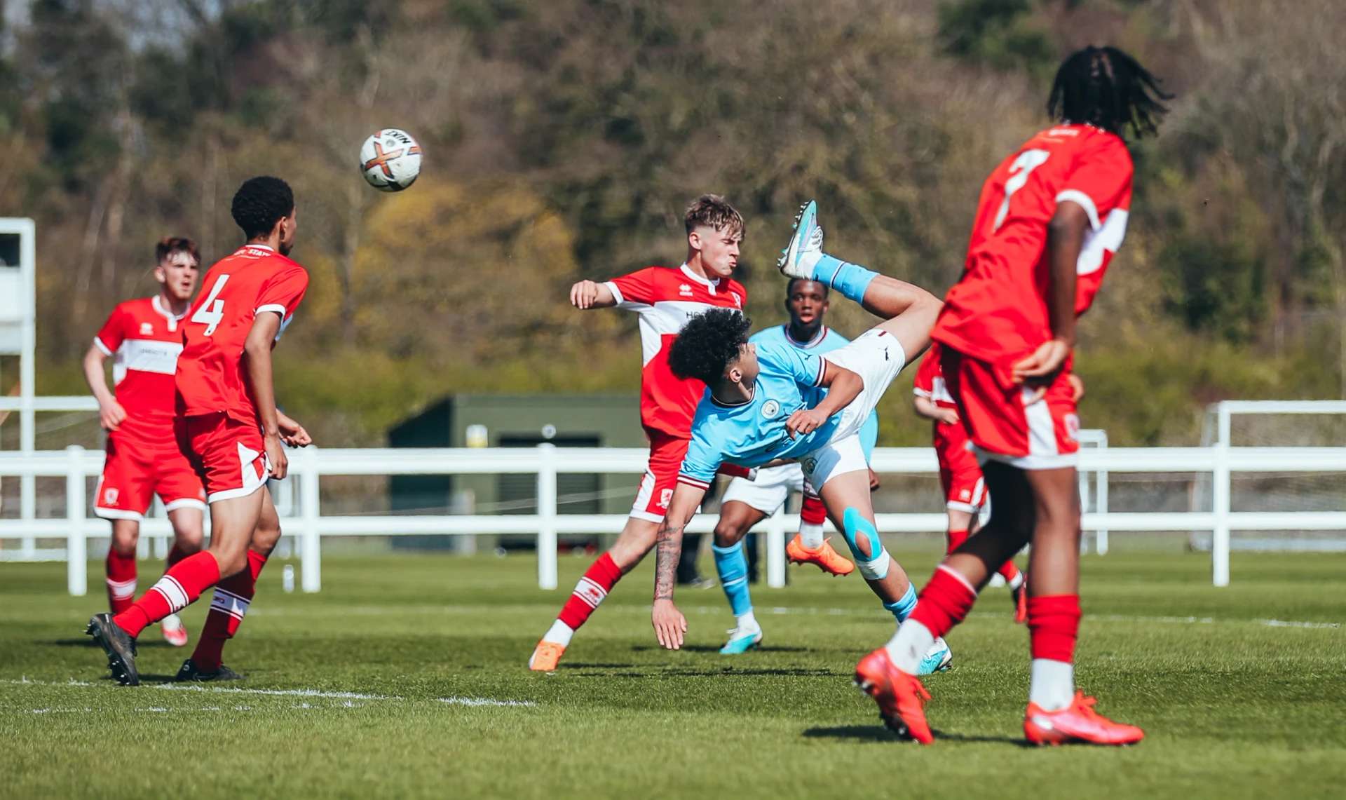 Khoảnh khắc O'Reilly thực hiện pha ghi bàn kiểu bọ cạp trong màu áo đội trẻ Man City.
