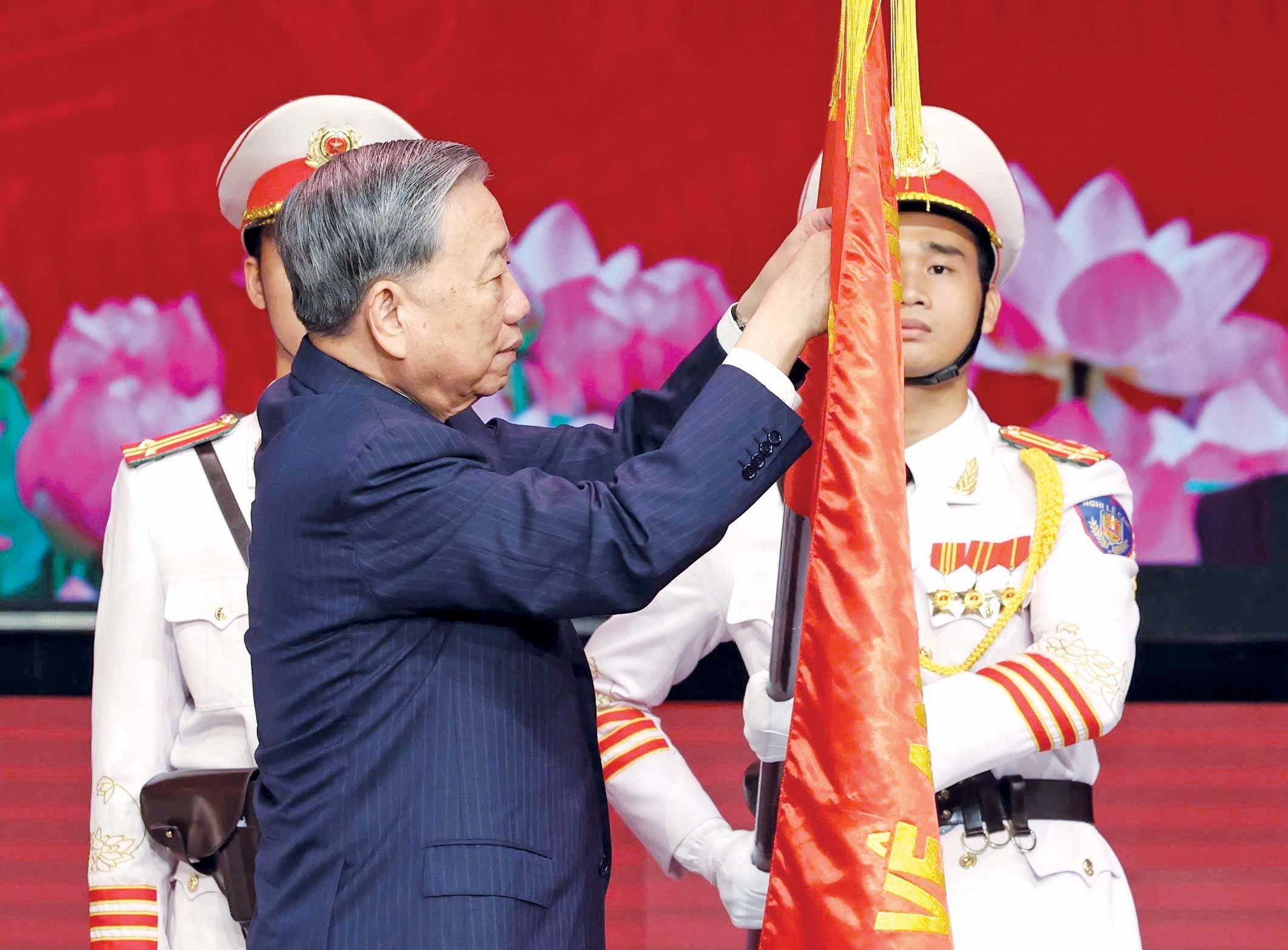 Tổng Bí thư Tô Lâm gắn Huân chương Sao Vàng lên lá cờ truyền thống của lực lượng Công an nhân dân Việt Nam. Ảnh: Nguyễn Hải