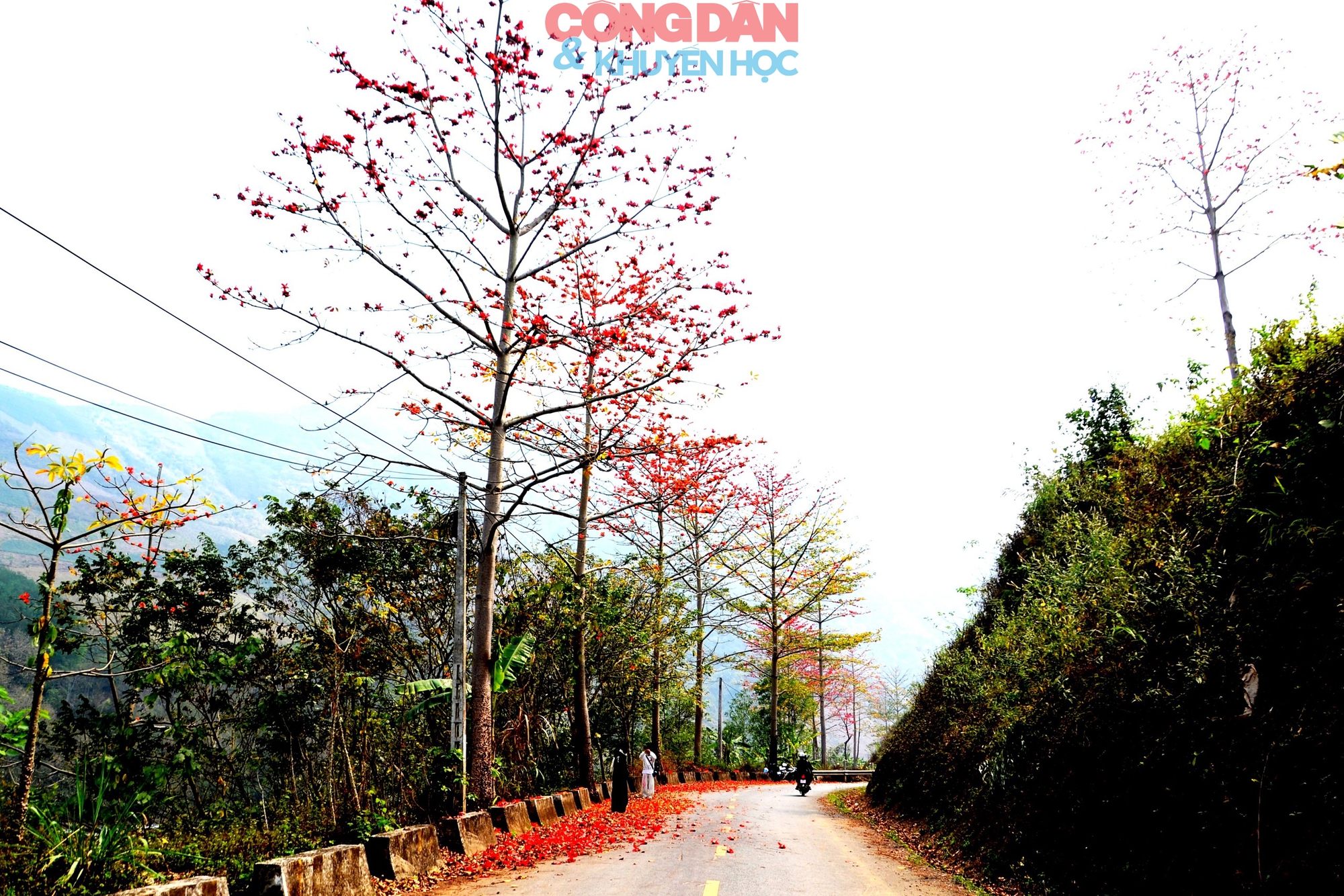 Hoa gạo nở đỏ rực như thắp lửa trên đường vào thôn Lũng Pô, xã A Mú Sung (Lào Cai). Ảnh: Quốc Hồng