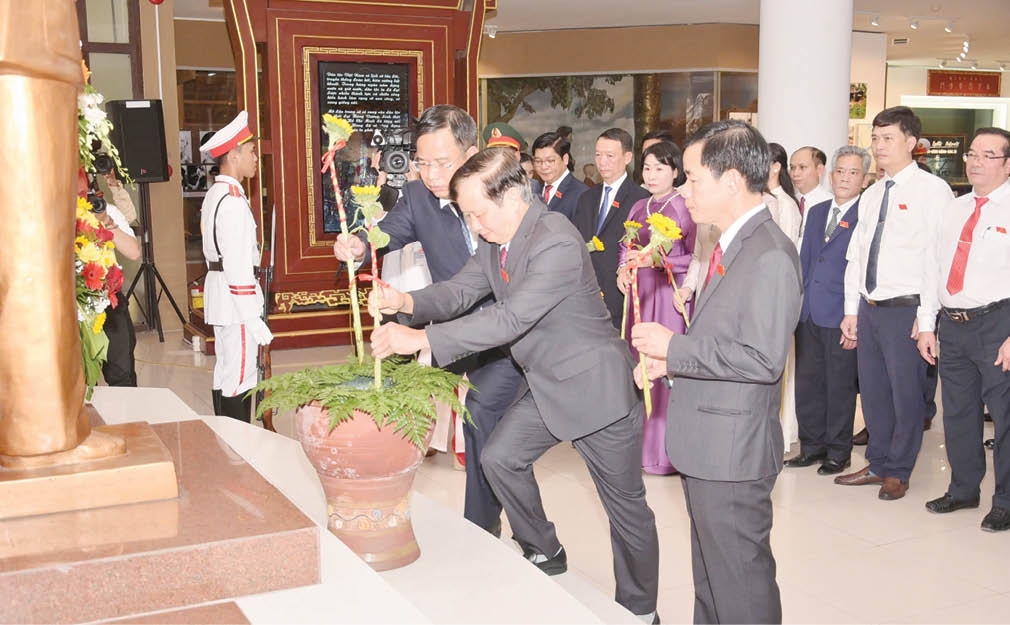 Các đại biểu dự Đại hội Đảng bộ thành phố Huế lần thứ XVII dâng hoa lên Chủ tịch Hồ Chí Minh tại Bảo tàng mang tên Người