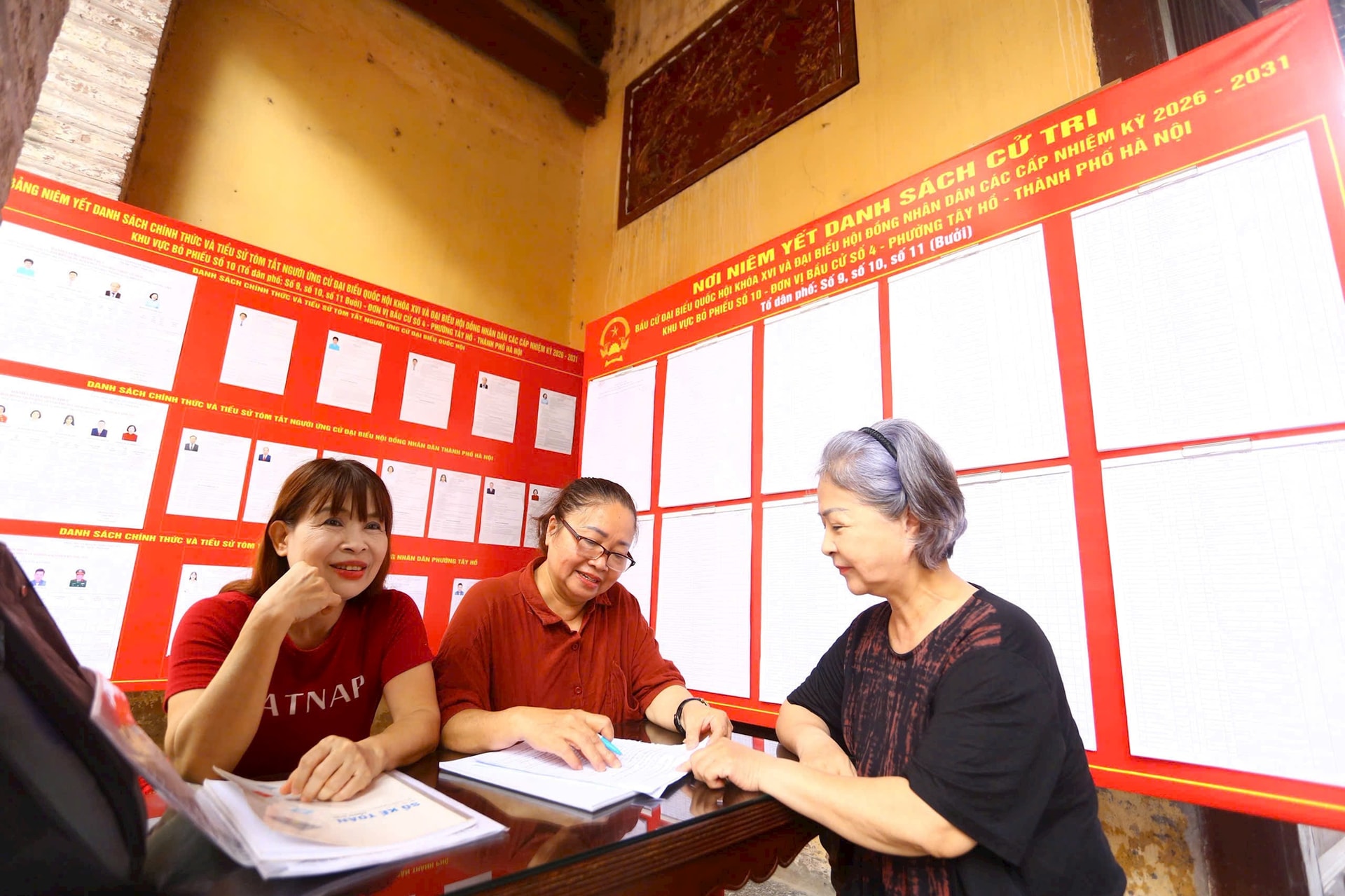 Các thành viên trong Tổ bầu cử của phường Bạch Mai rà soát lại danh sách cử tri và tiểu sử của các ứng cử viên. Ảnh: Đình Hiệp