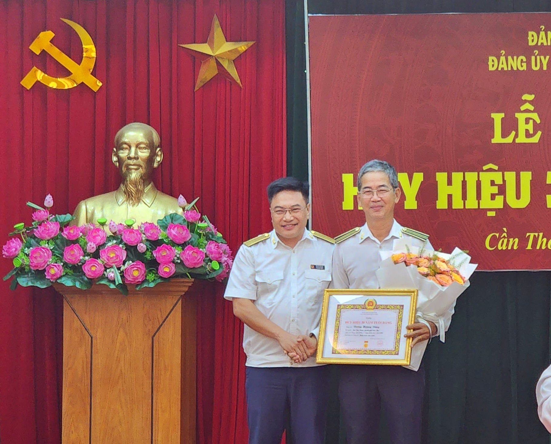 Đồng chí Nguyễn Đức Sỹ - Bí thư Đảng ủy KTNN khu vực V - đã gắn Huy hiệu cho đồng chí Dương Hoàng Dũng. Ảnh: Tố Như