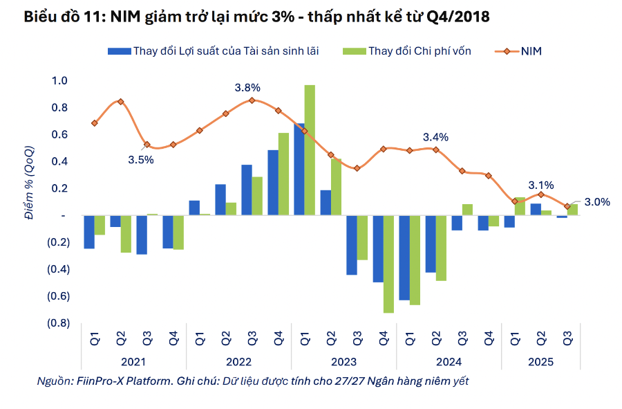 NIM toàn ngành giảm trở lại về ~3,0%, thấp nhất kể từ cuối 2018, chủ yếu do tác động từ HDB với NIM giảm -1,2 điểm phần trăm so với cùng kỳ 2024 và so với quý 2/2025.