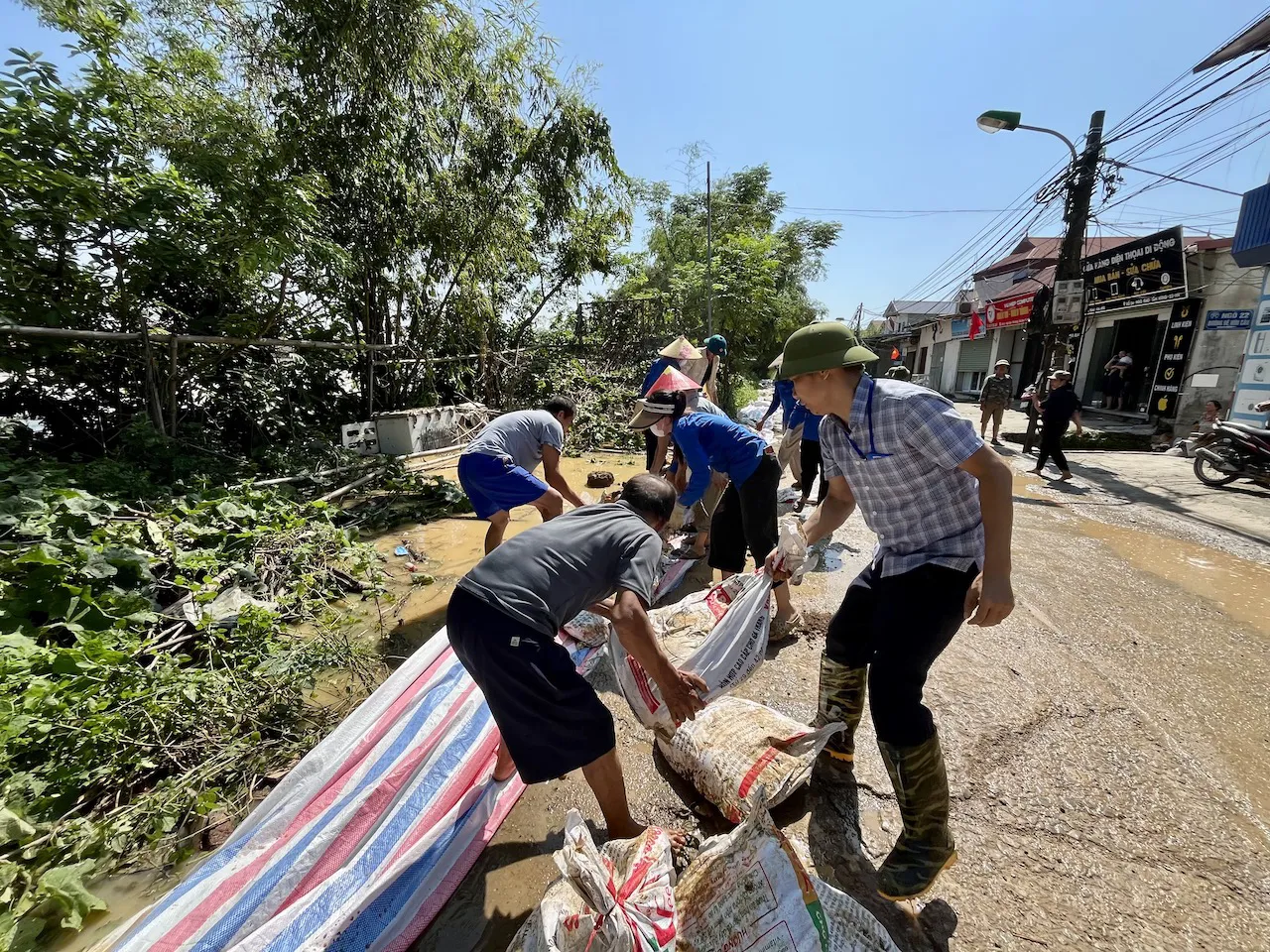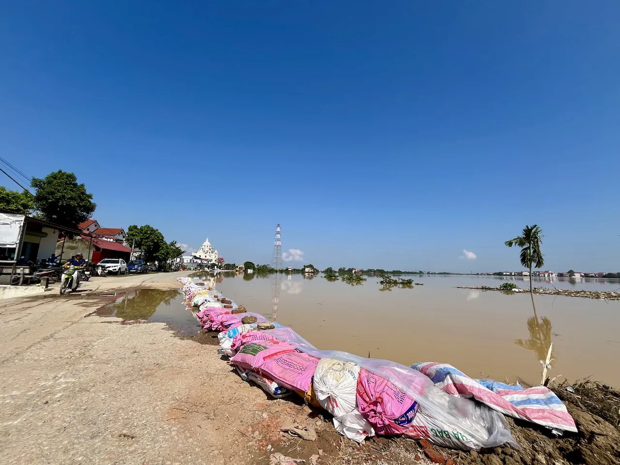 Sáng 9/10, hàng trăm người dân vẫn túc trực cùng cán bộ, chiến sĩ, sẵn sàng tiến hành gia cố những đoạn đê hữu Cầu bị tràn, bảo vệ vùng dân cư trong đê.