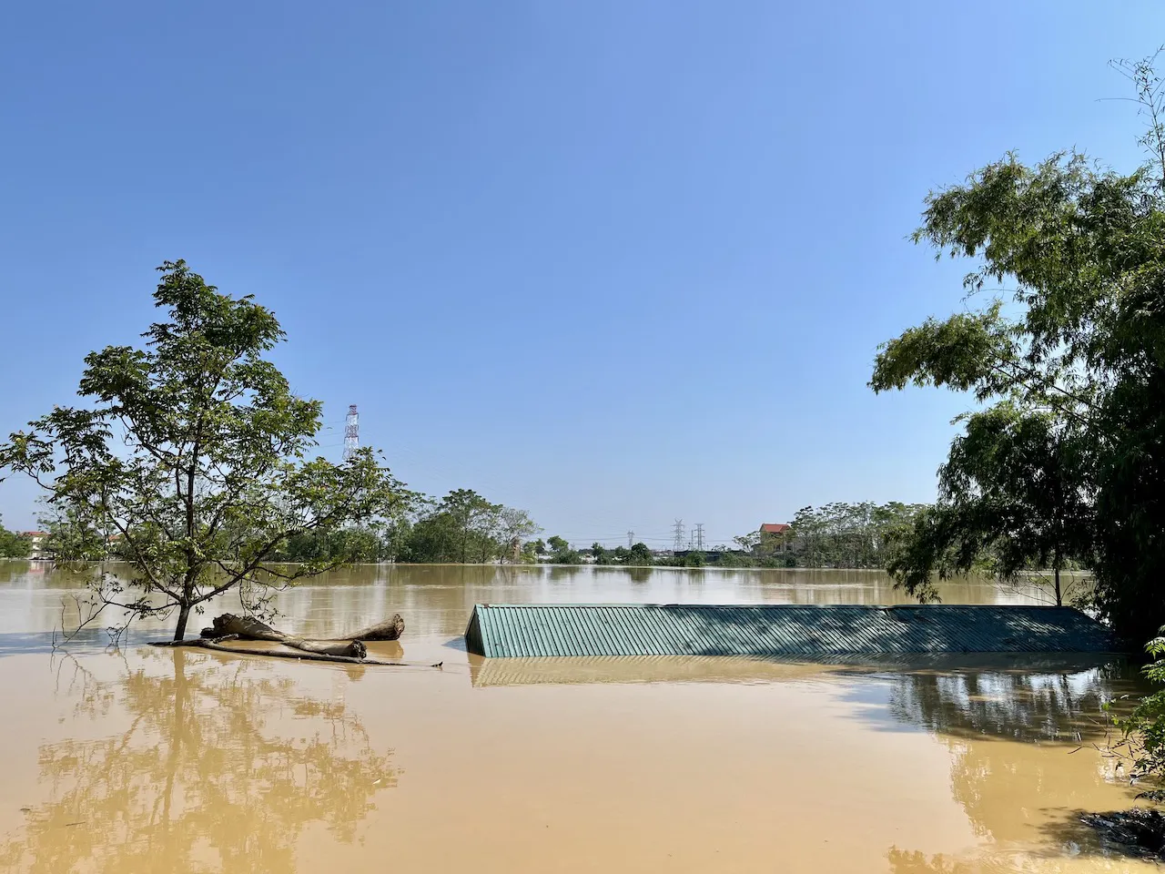Mực nước sông lên cao đã nhấn chìm khu vực dân cư bên ngoài sông. Hàng chục ngôi nhà bị ngập đến tận mái tôn.