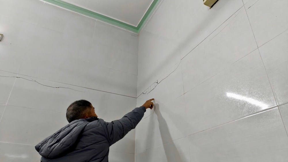 Ông Hà Xuân Hải (60 tuổi) bức xúc: Nhà tôi mới xây năm 2021, làm rất kiên cố, thế nhưng do xe trọng tải lớn chạy quá nhiều đã ảnh hưởng đến công trình. Tường nhà bị nứt ngang, trần nứt thấm nước. Đợt mưa to vừa rồi nước ngấm qua các khe nứt chảy tràn hết vào nhà.