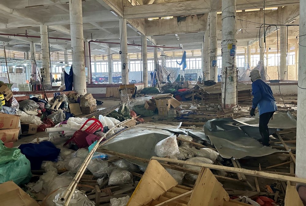 Toàn bộ gian hàng trên tầng 2 chợ Rồng cùng hệ thống phòng cháy chữa cháy đang gấp rút được tháo dỡ