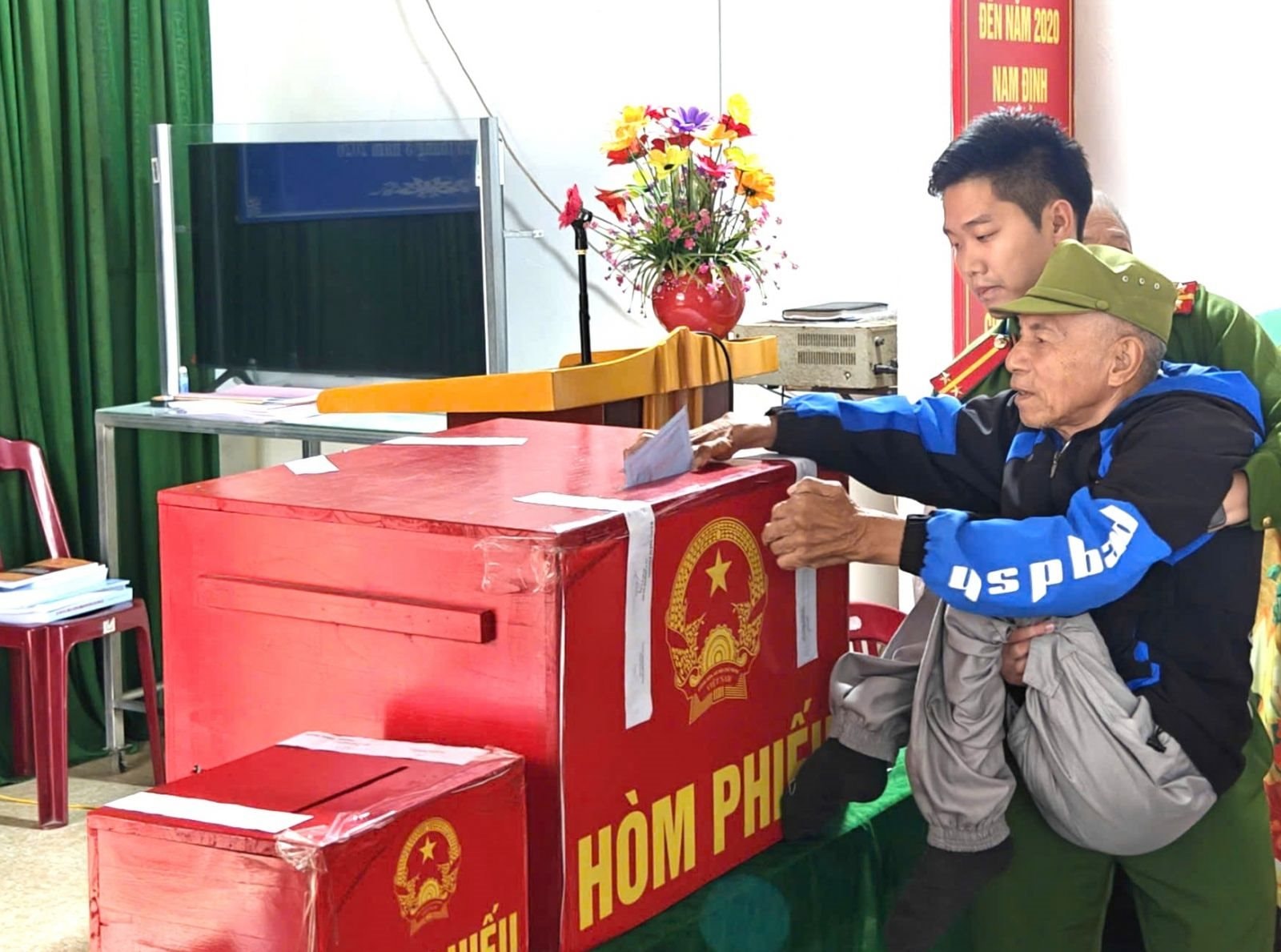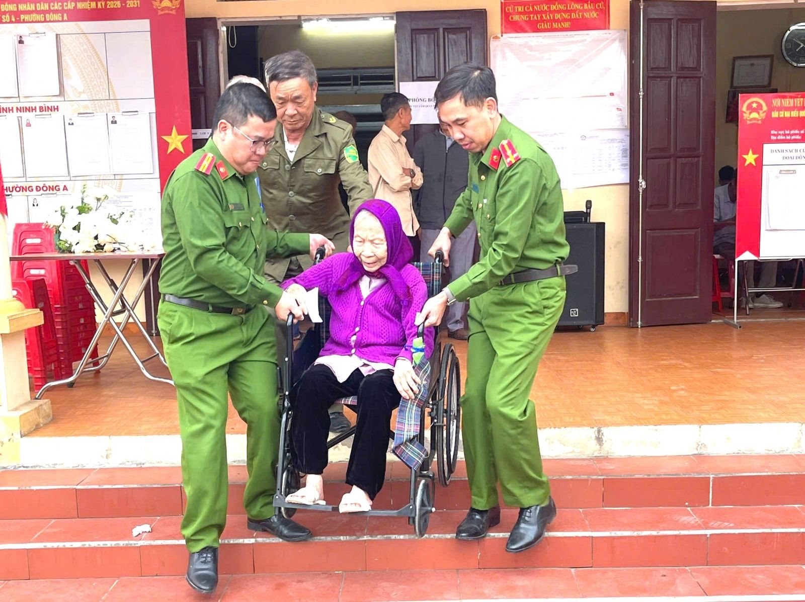 Lực lượng Công an tỉnh Ninh Bình giúp đỡ cử tri cao tuổi, già yếu, cử tri là người khuyết tật tham gia bầu cử.