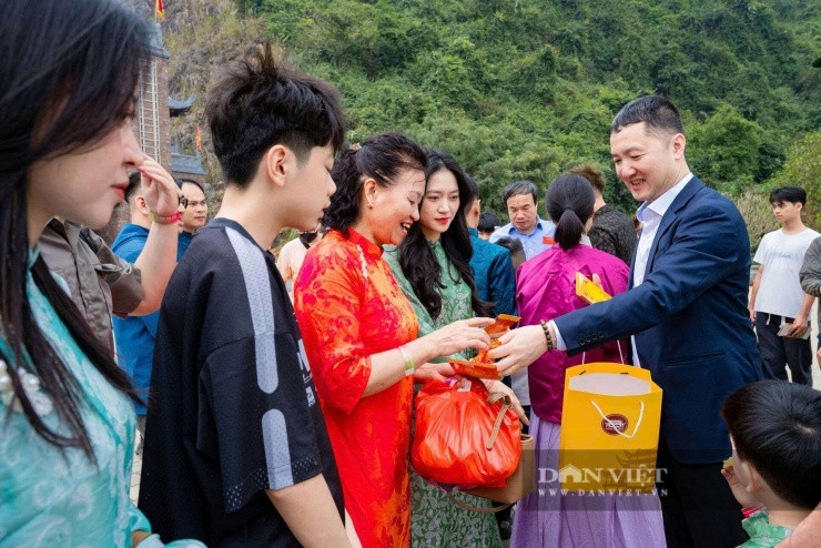 Ông Bùi Văn Mạnh - Giám đốc Sở Du lịch Ninh Bình lì xì cho du khách "xông đất" đầu năm.