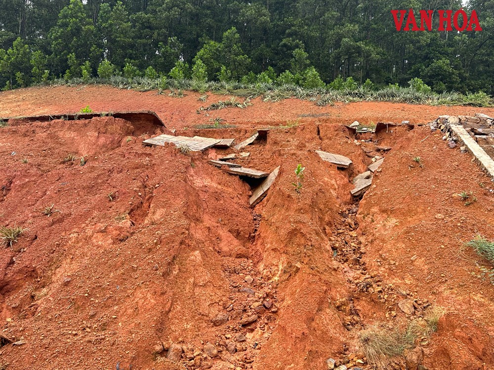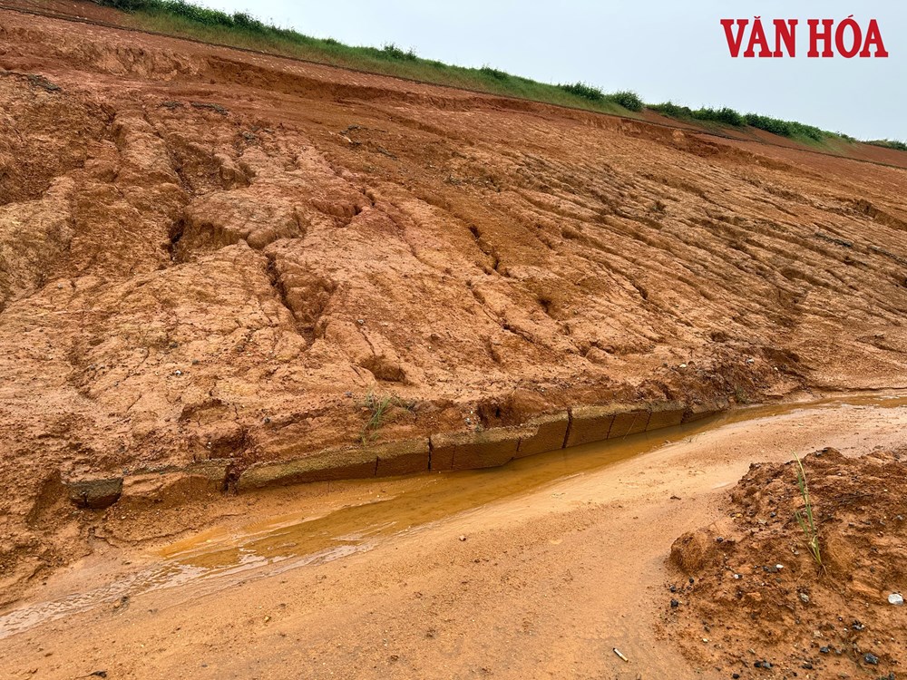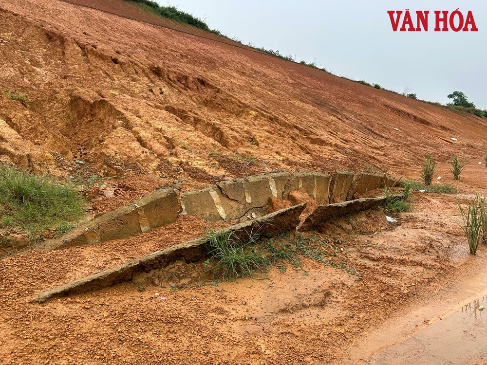 Nhiều vị trí trên mái tayluy sụt thành những hố lớn, những vết nứt chạy dài, các dòng nước chảy tạo thành vệt ăn sâu vào mái taluy