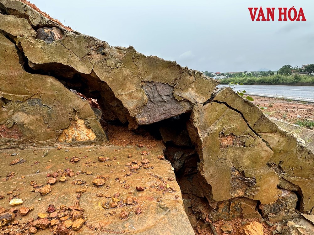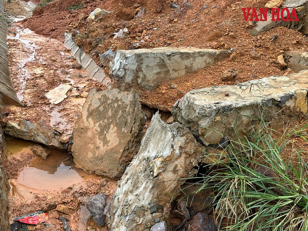 Có những đoạn kênh thoát nước dọc đường bị bẻ gãy, biến dạng, đất đá đẩy trồi cả lên mặt đường