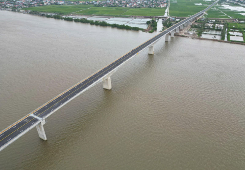 Công trình cầu vượt sông Đáy là hạng mục trọng điểm thuộc dự án xây dựng tuyến đường bộ ven biển đoạn qua tỉnh Ninh Bình (giai đoạn I). Ảnh: THÁI BÁ