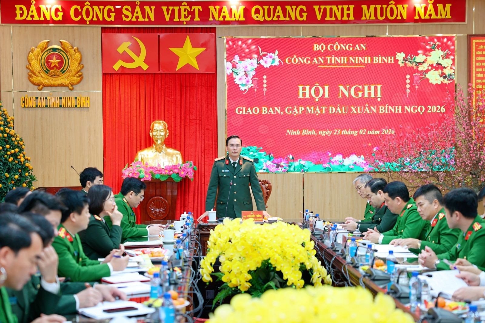 Sáng ngày 23/2, phát biểu tại hội nghị giao ban, gặp mặt đầu Xuân Bính Ngọ 2026, Thượng tá Cù Quốc Thắng, Giám đốc Công an tỉnh Ninh Bình ghi nhận, biểu dương, đánh giá cao nỗ lực của cán bộ, chiến sĩ các đơn vị Công an toàn tỉnh trong thời gian qua.