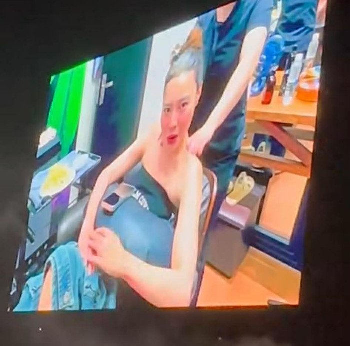 Xuất hiện trong clip, Ninh Dương Lan Ngọc đang ngồi trên ghế, phía sau là một ê-kíp hỗ trợ. Nữ diễn viên diện trang phục quây màu tối, để lộ vai trần, phần tóc được búi cao gọn gàng. Điều khiến khán giả không nhịn được cười chính là biểu cảm có phần “bất lực”, gương mặt gần như mộc, đang trong khoảnh khắc được massage hoặc chăm sóc hậu trường, hoàn toàn trái ngược với hình ảnh lung linh thường thấy trên thảm đỏ. Khung cảnh hậu trường bừa bộn với bàn ghế, chai nước, vật dụng cá nhân càng khiến đoạn clip thêm phần chân thật và hài hước.