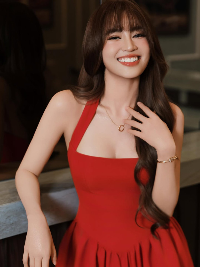 Mái tóc xoăn sóng bồng bềnh và lớp trang điểm được chăm chút kỹ lưỡng giúp người đẹp khoe trọn visual trẻ trung trước ống kính. Cô còn hào hứng chia sẻ: “Đỏ đỏ cho nhiều may mắn 2026”.