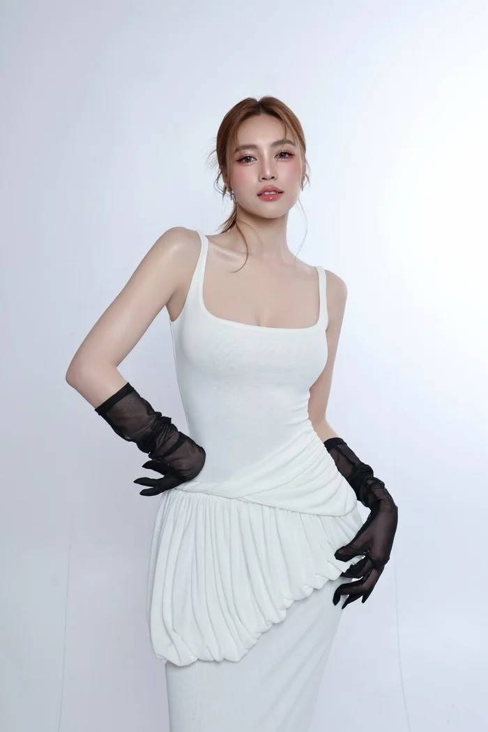 Trong loạt ảnh, người đẹp lựa chọn mẫu váy hai dây khoét ngực, ôm sát cơ thể để tôn lên đường cong quyến rũ.