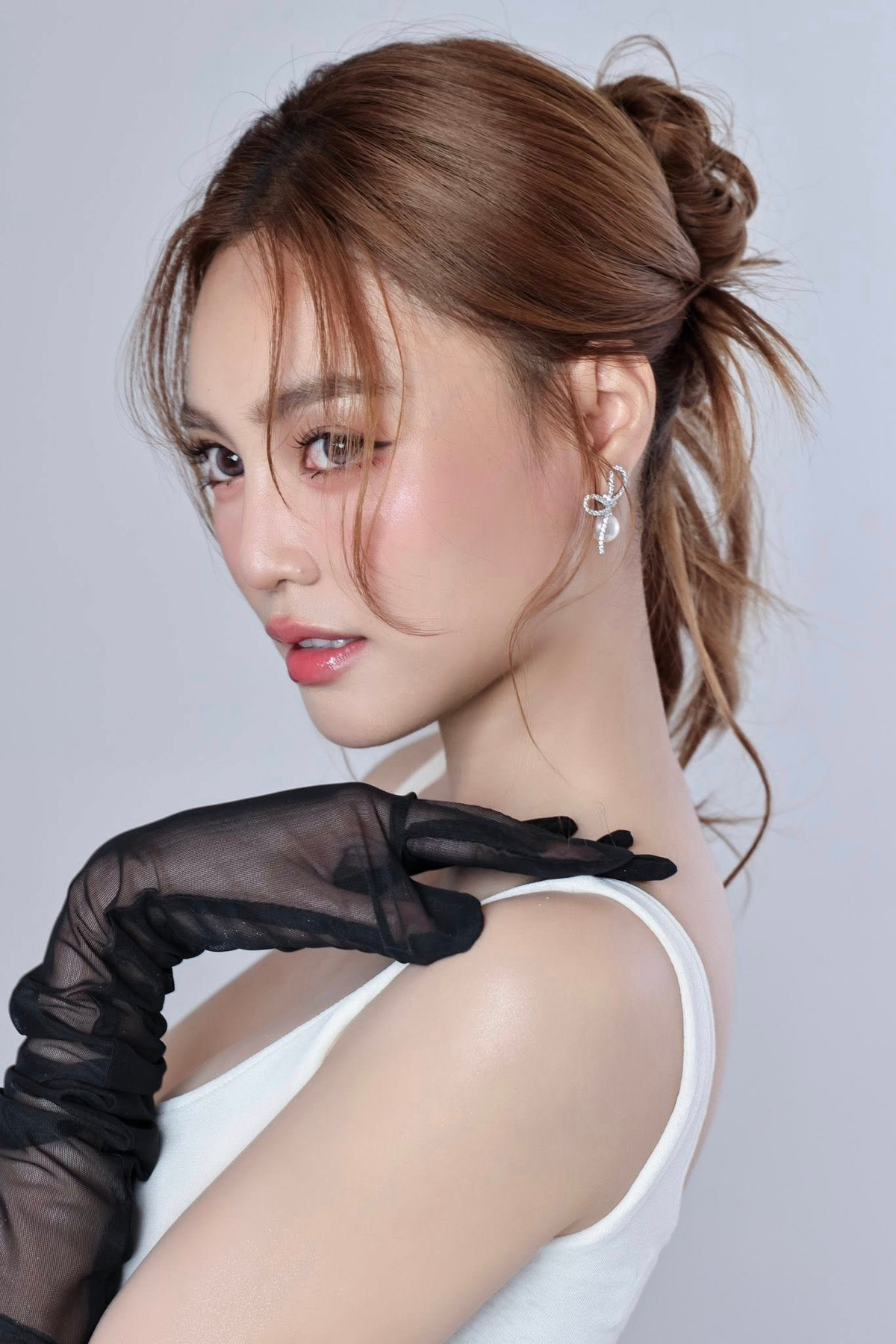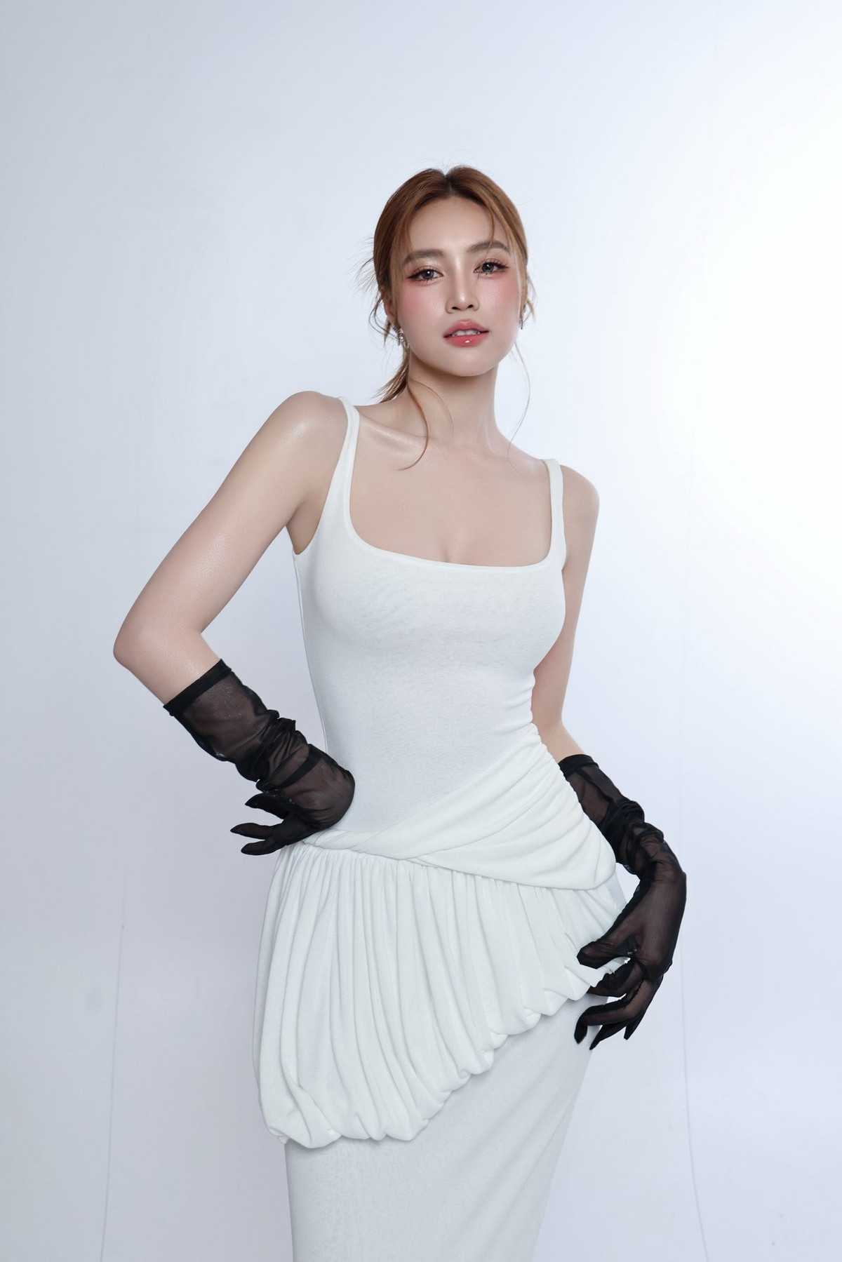 Chi tiết bèo nhúm cầu kỳ ở phần eo cùng đôi găng tay đen tạo nên điểm nhấn độc đáo, giúp hình ảnh của Lan Ngọc vừa sang trọng, vừa mang hơi thở hiện đại.