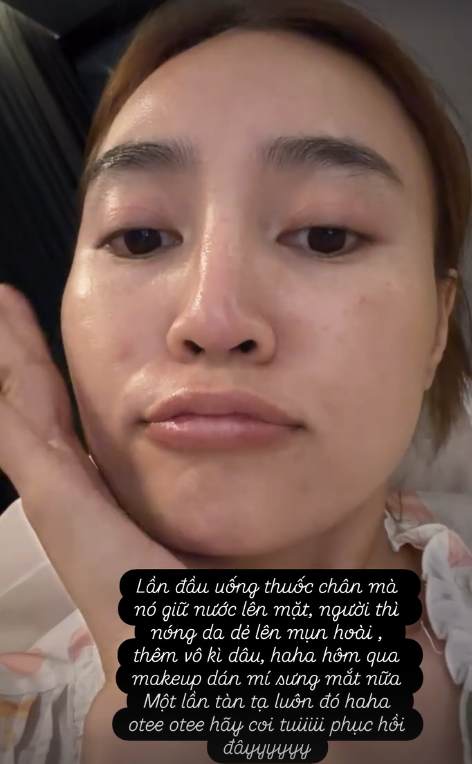 Cô viết đầy hài hước nhưng cũng không giấu được sự mệt mỏi:“Lần đầu uống thuốc chân mà nó giữ nước lên mặt, người thì nóng da dễ lên mụn hoài, thêm vô kỳ dâu, haha hôm qua makeup dán mí sưng mắt nữa. Một lần tàn tạ luôn đó haha. Oke oke hãy coi tôi phục hồi đây…”.