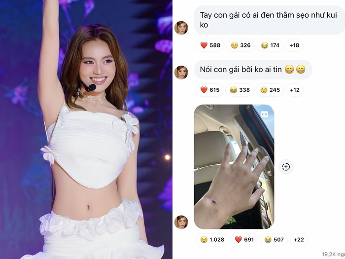 Trong bức ảnh, nữ diễn viên để lộ bàn tay bị trầy và có dấu sẹo khá rõ, kèm dòng chú thích dí dỏm: “Tay con gái có ai đen thâm sẹo như tôi không. Bởi nói con gái không ai tin”.