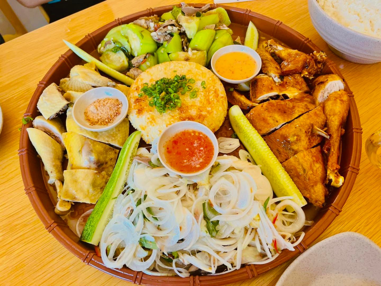Cơm gà Phan Rang: Gạo nấu cùng bột nghệ thơm dẻo, thịt gà thả vườn săn chắc.