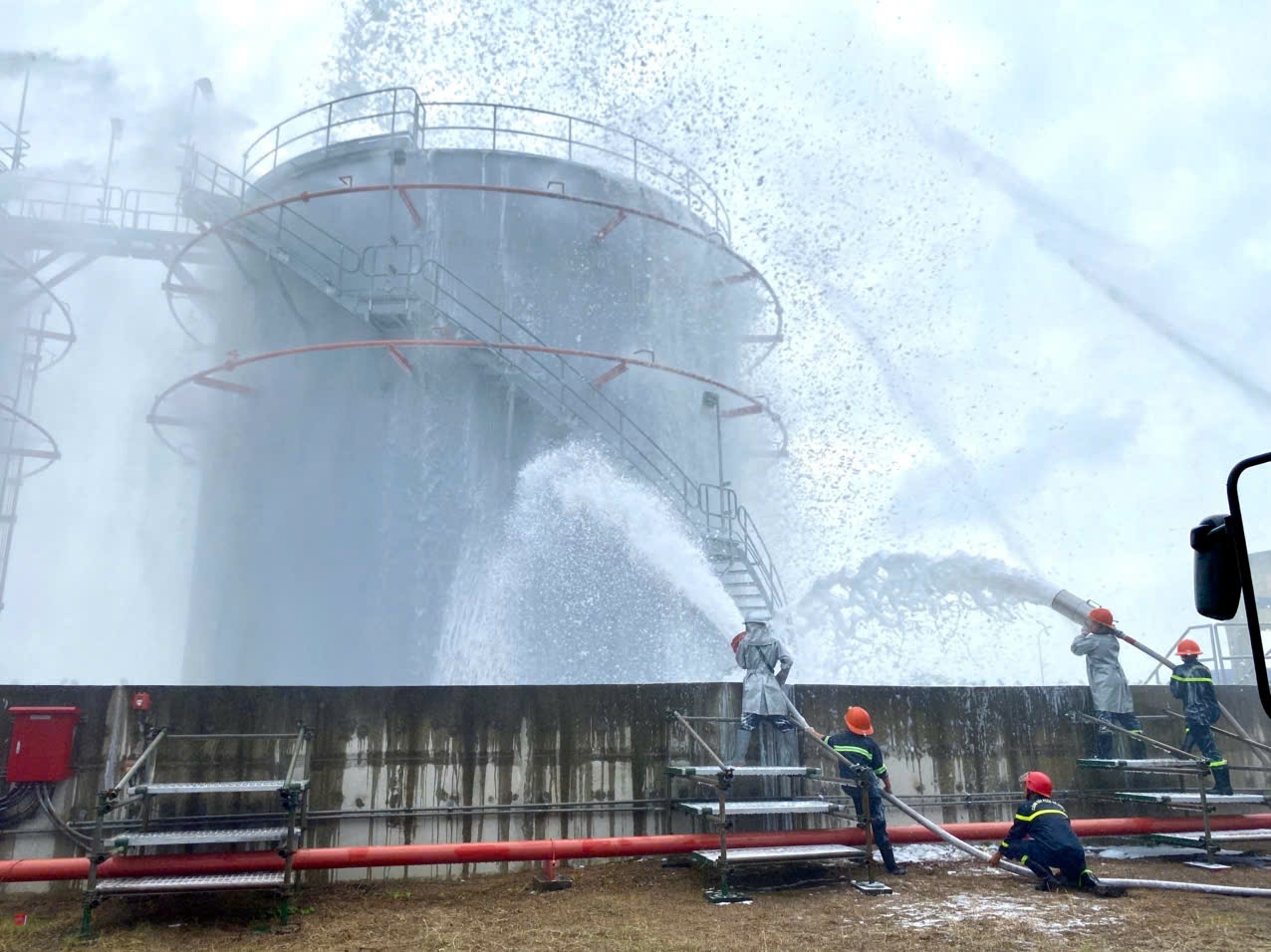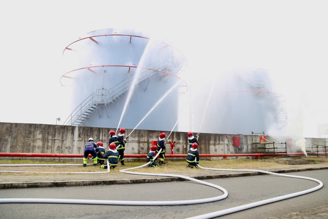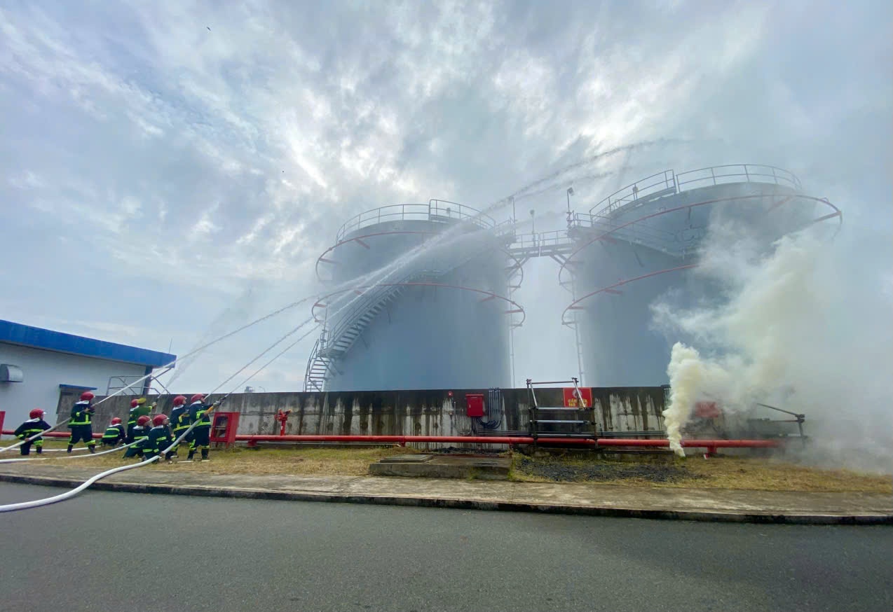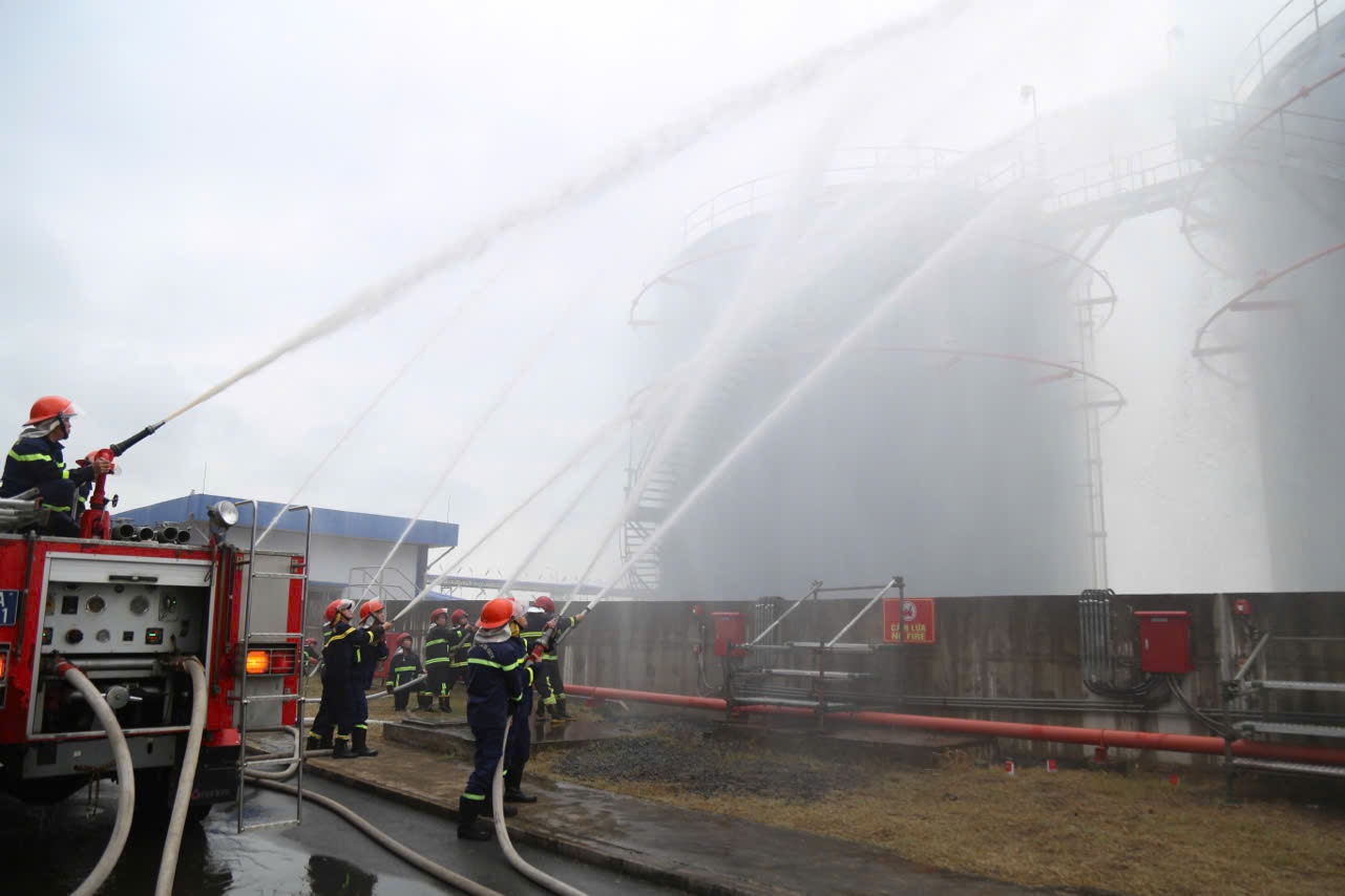Các van liên kết giữa các bể chứa xăng, dầu được đóng lại, triển khai lăng phun cố định tại thành bể để làm mát bể bị cháy và các bể lân cận.