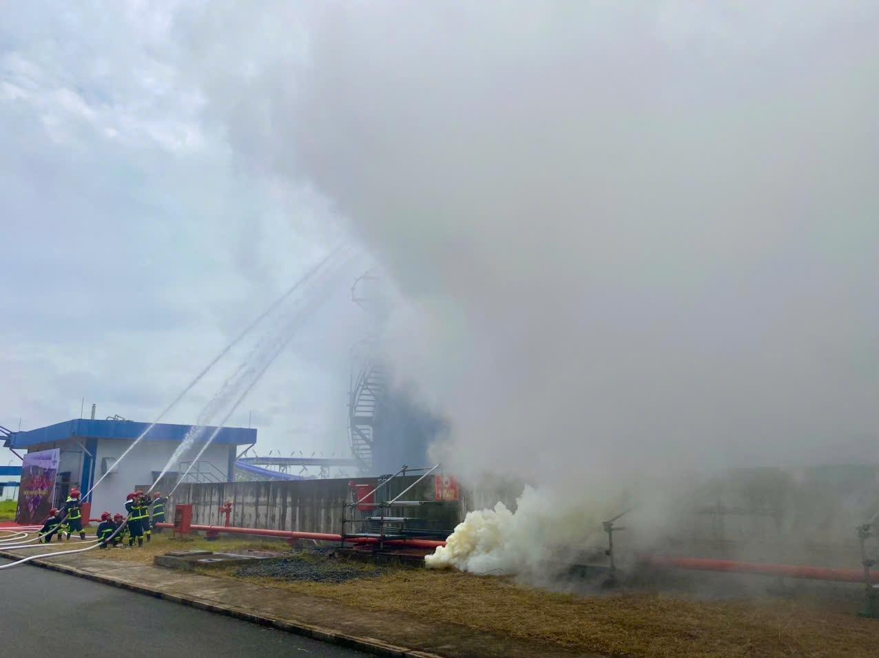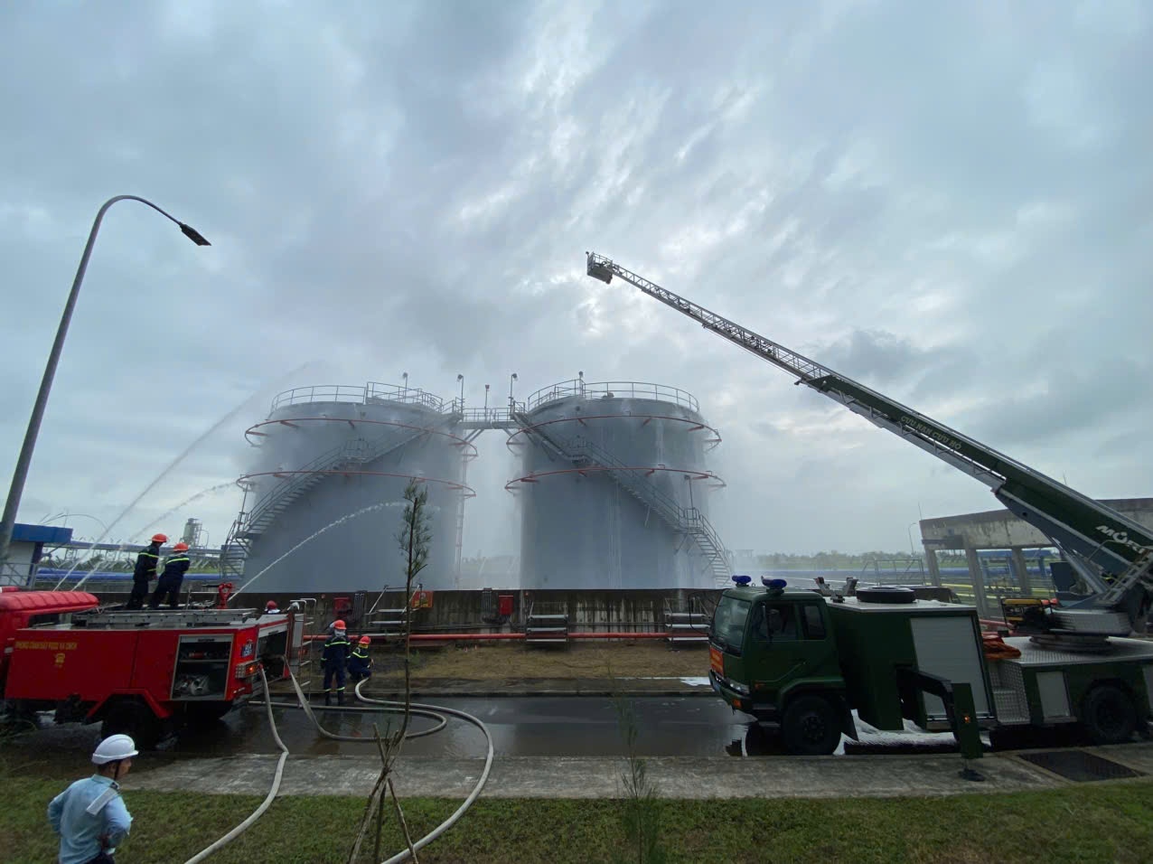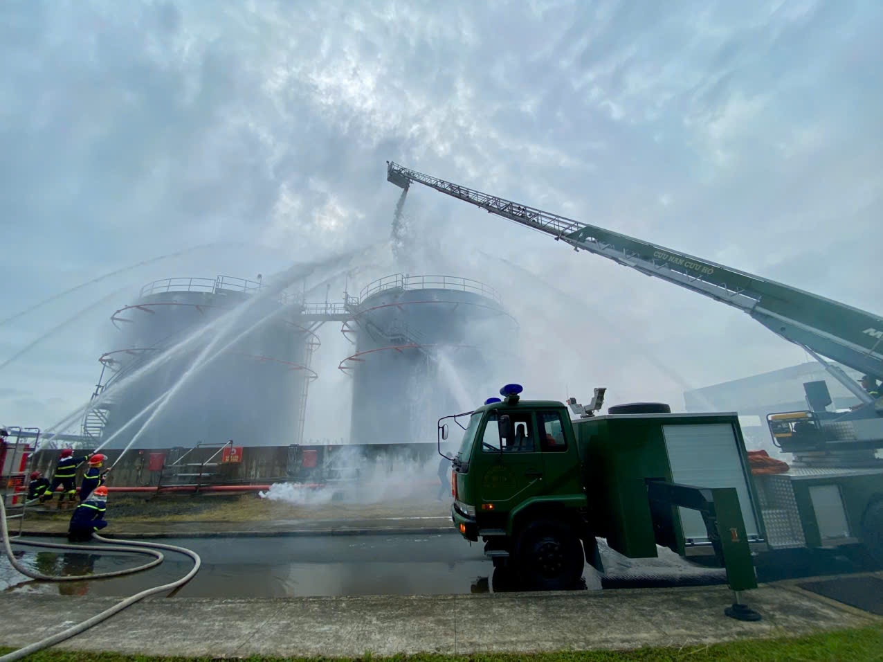 Các van liên kết giữa các bể chứa xăng, dầu được đóng lại, triển khai lăng phun cố định tại thành bể để làm mát bể bị cháy và các bể lân cận.