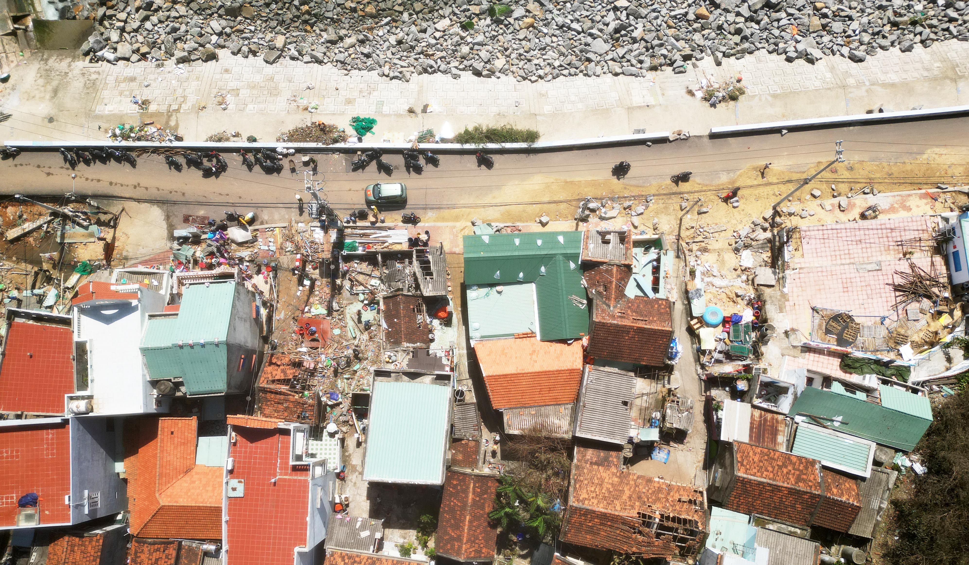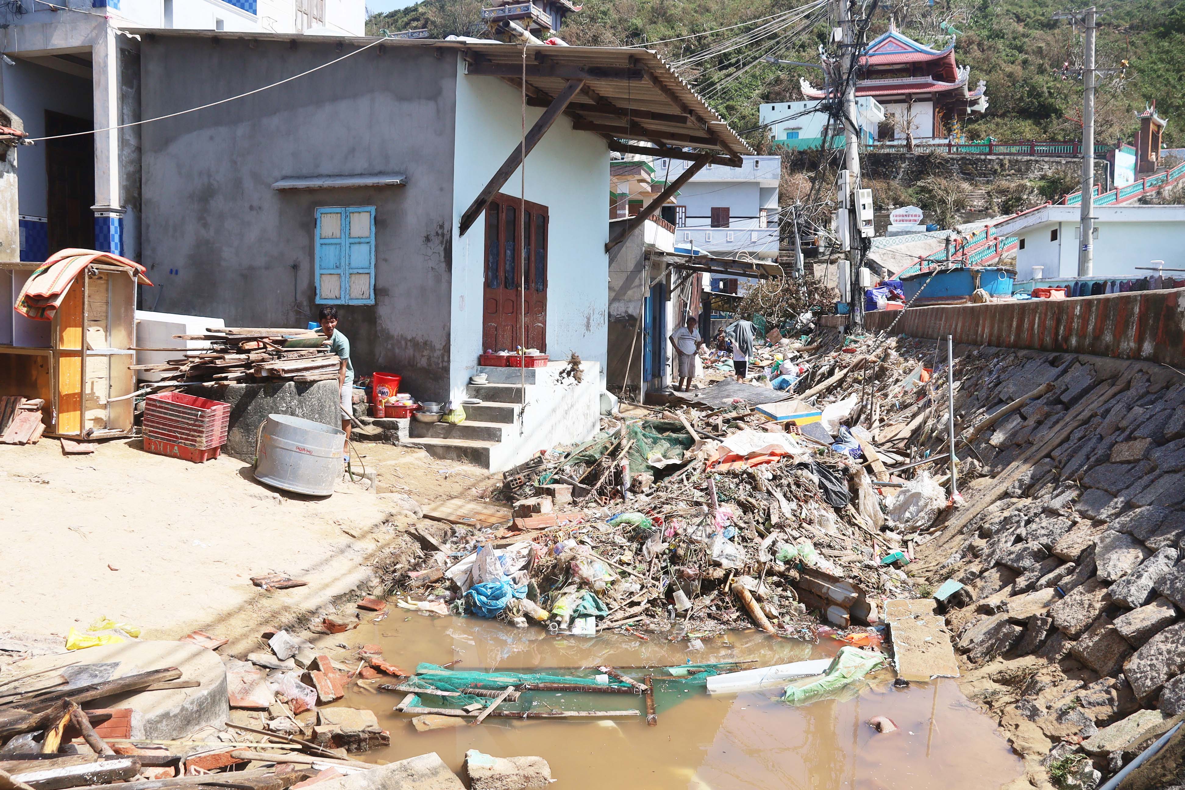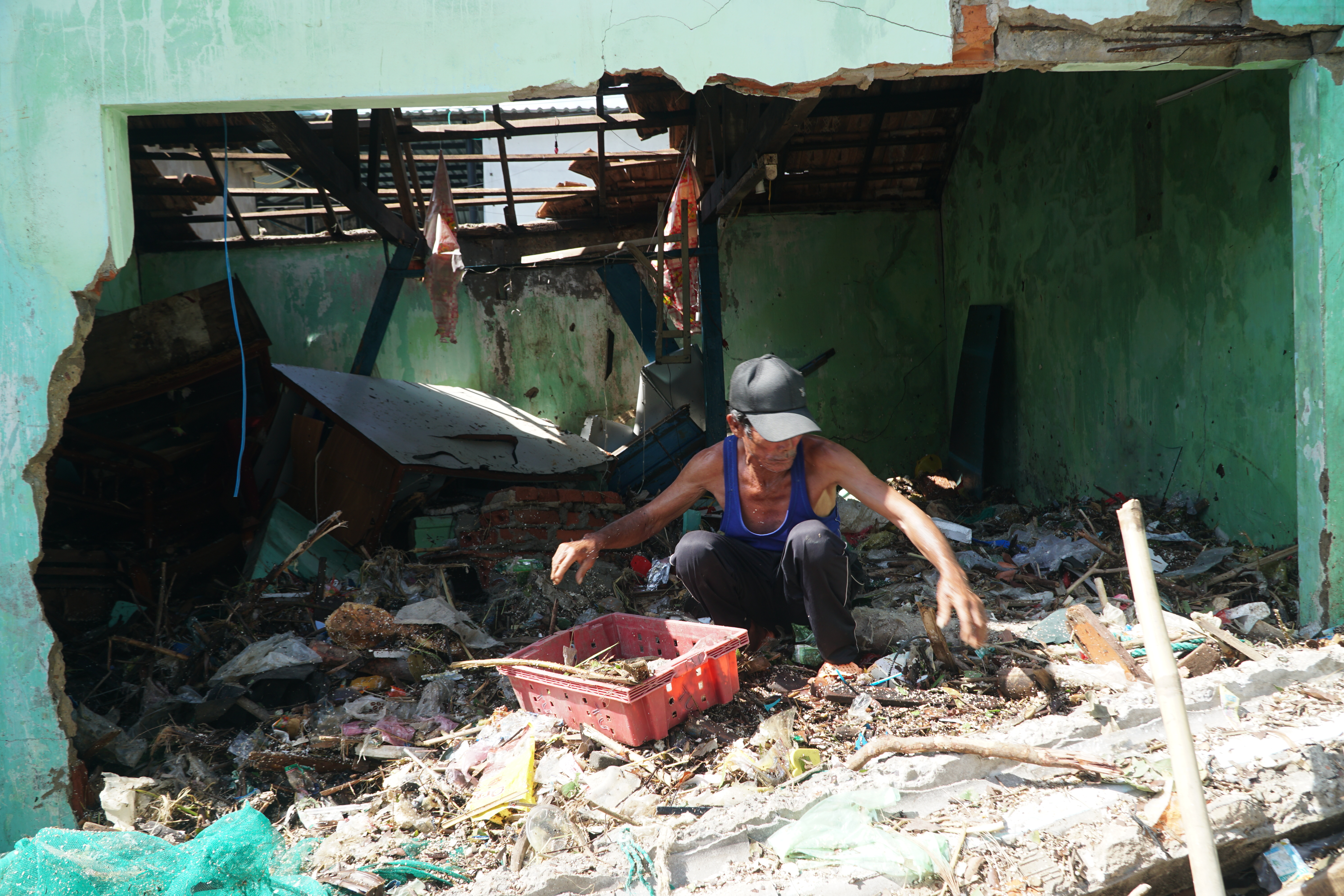 Khung cảnh đổ nát sau bão, triều cường ở làng chài bán đảo Nhơn Lý