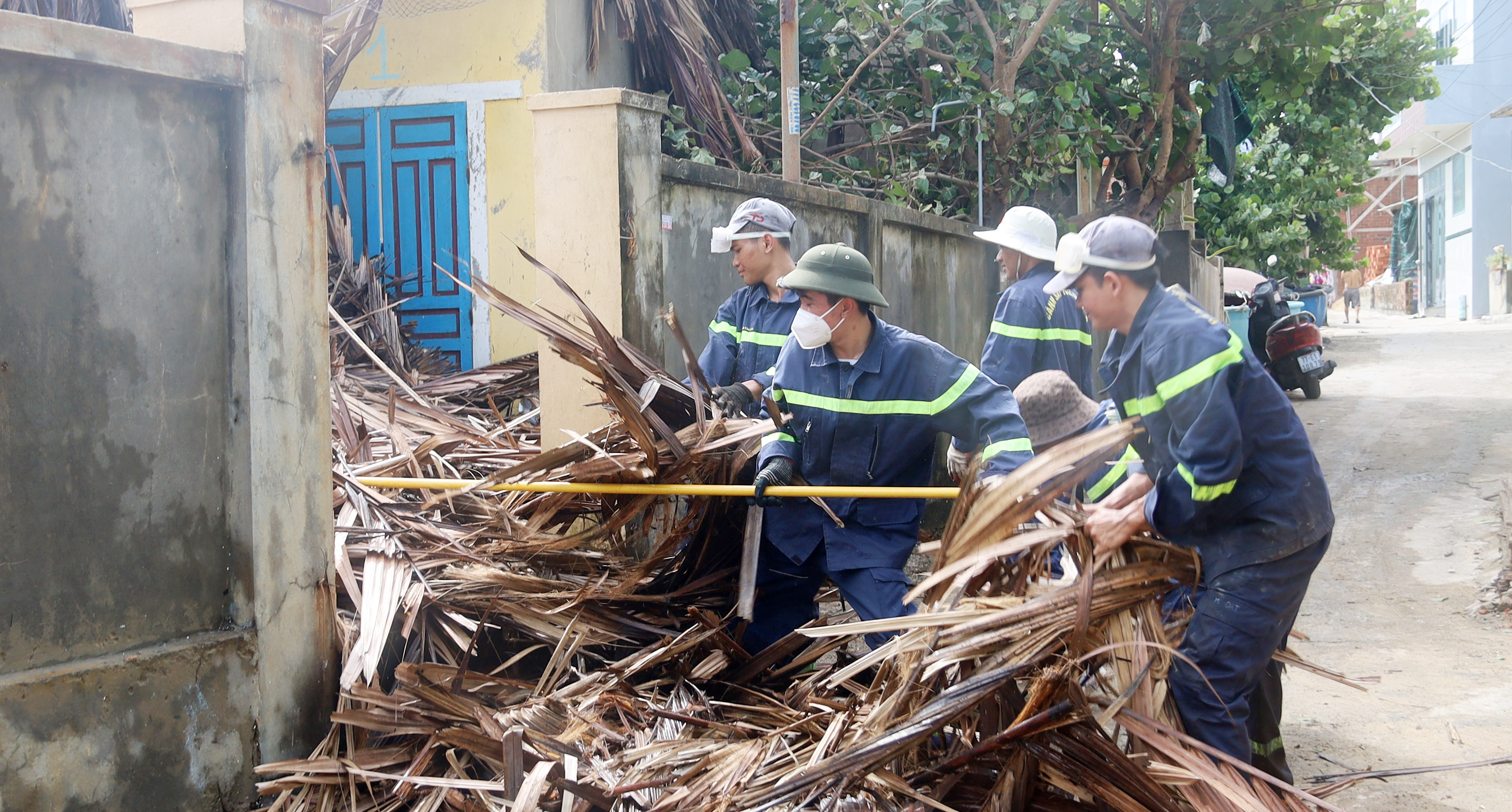 Cán bộ, chiến sĩ công an được huy động dọn dẹp đổ nát sau bão số 13 ở bán đảo Nhơn Lý