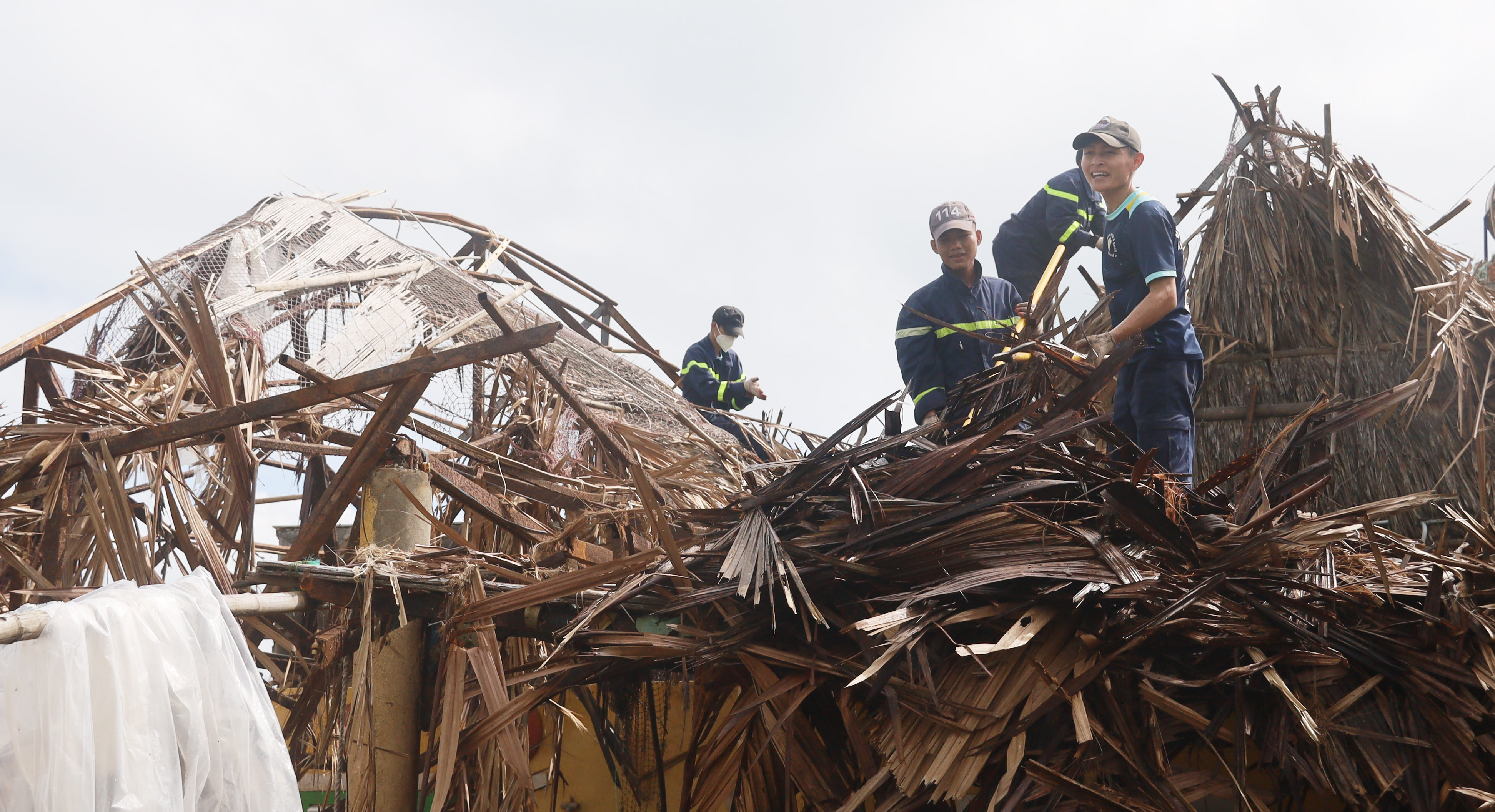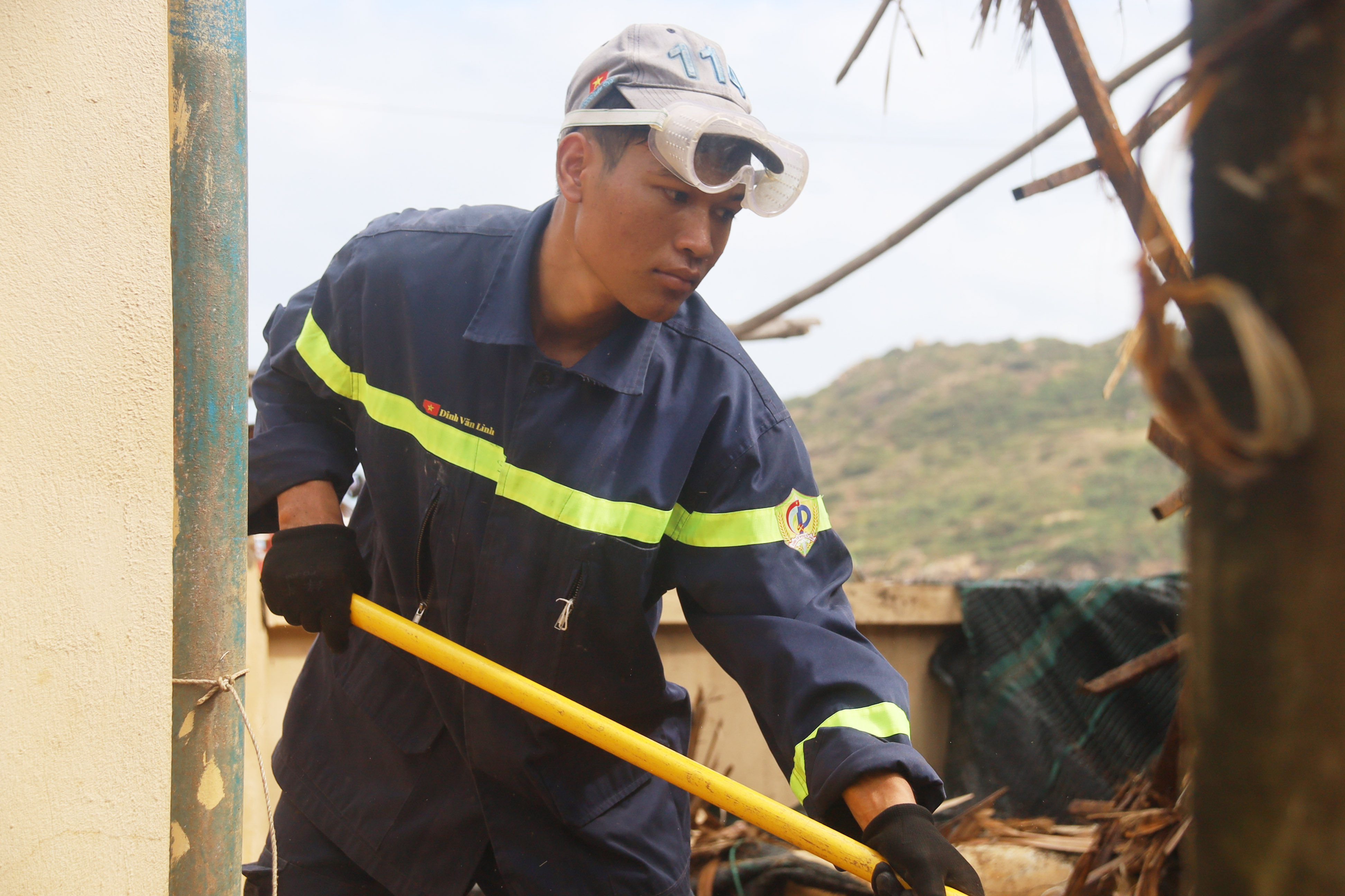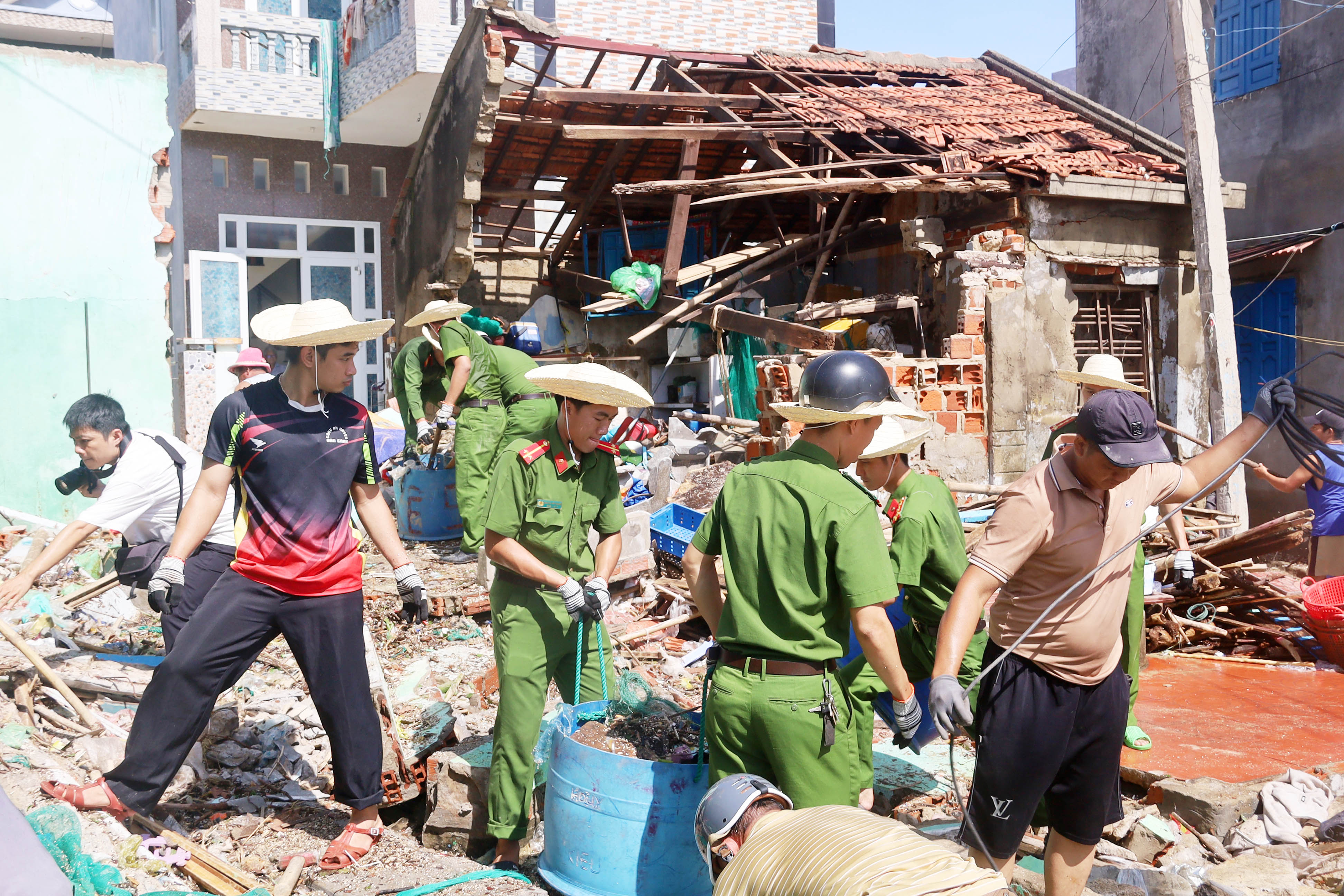 Tại ven biển bán đảo Nhơn Lý (phường Quy Nhơn Đông, Gia Lai), hàng trăm cán bộ, chiến sĩ Công an tỉnh Gia Lai được huy động để tổng lực giúp người dân khắc phục nhà cửa, thiệt hại sau bão.