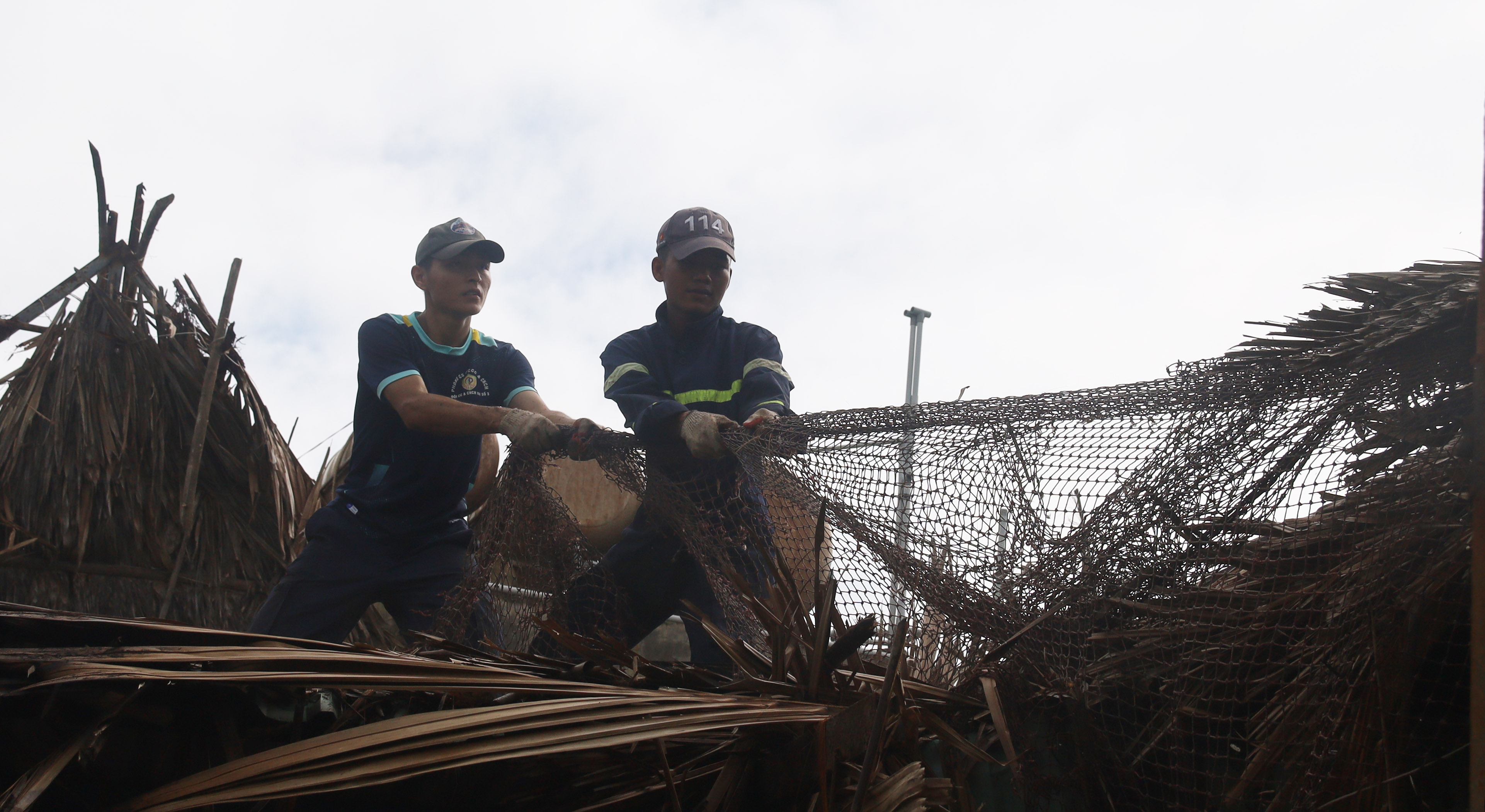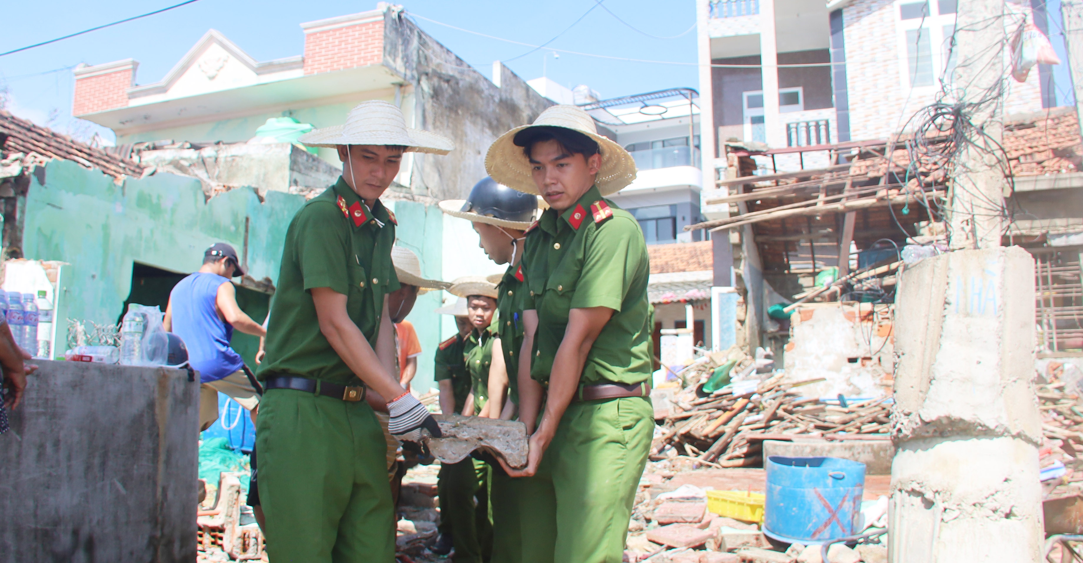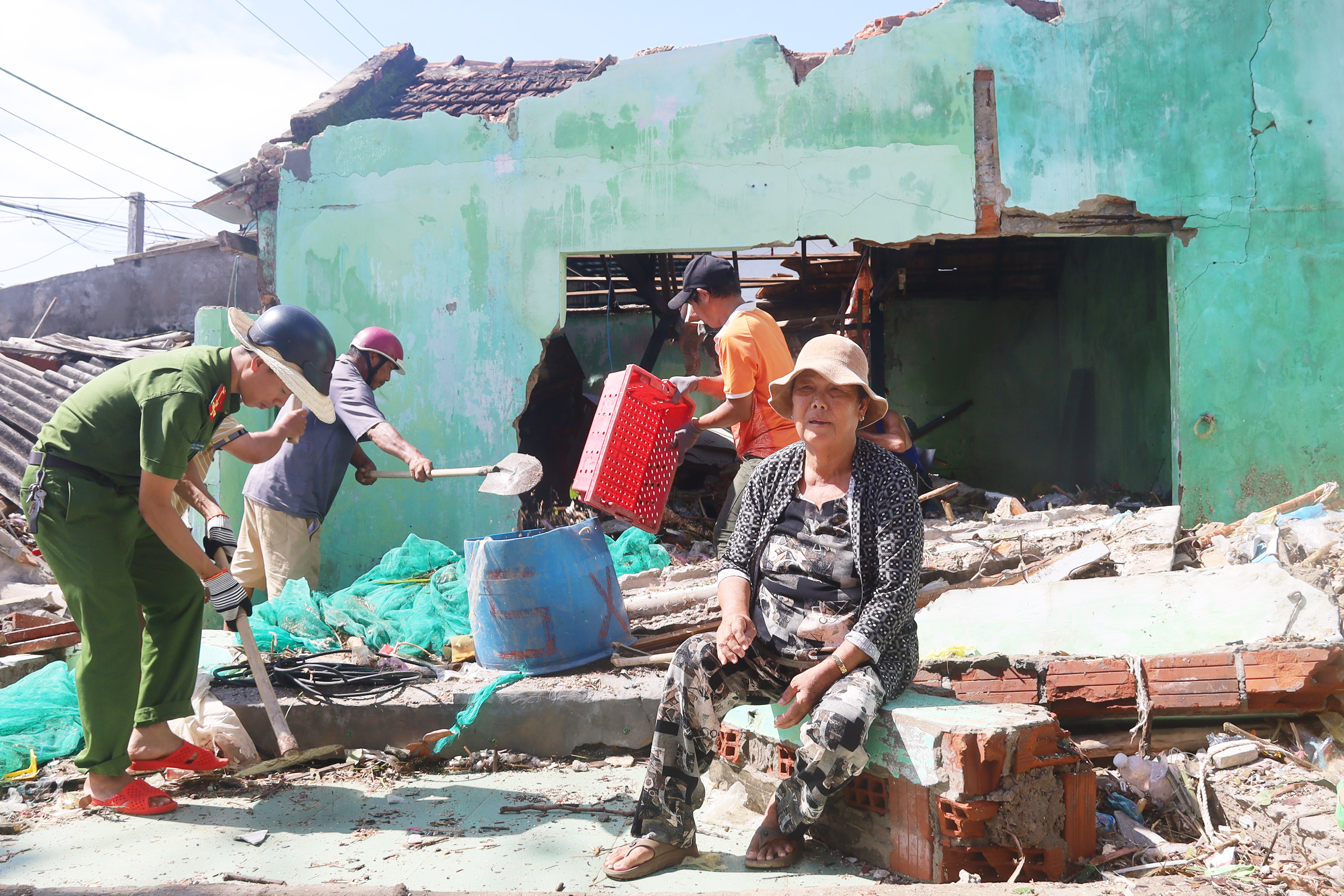 Tại ven biển bán đảo Nhơn Lý (phường Quy Nhơn Đông, Gia Lai), hàng trăm cán bộ, chiến sĩ Công an tỉnh Gia Lai được huy động để tổng lực giúp người dân khắc phục nhà cửa, thiệt hại sau bão.