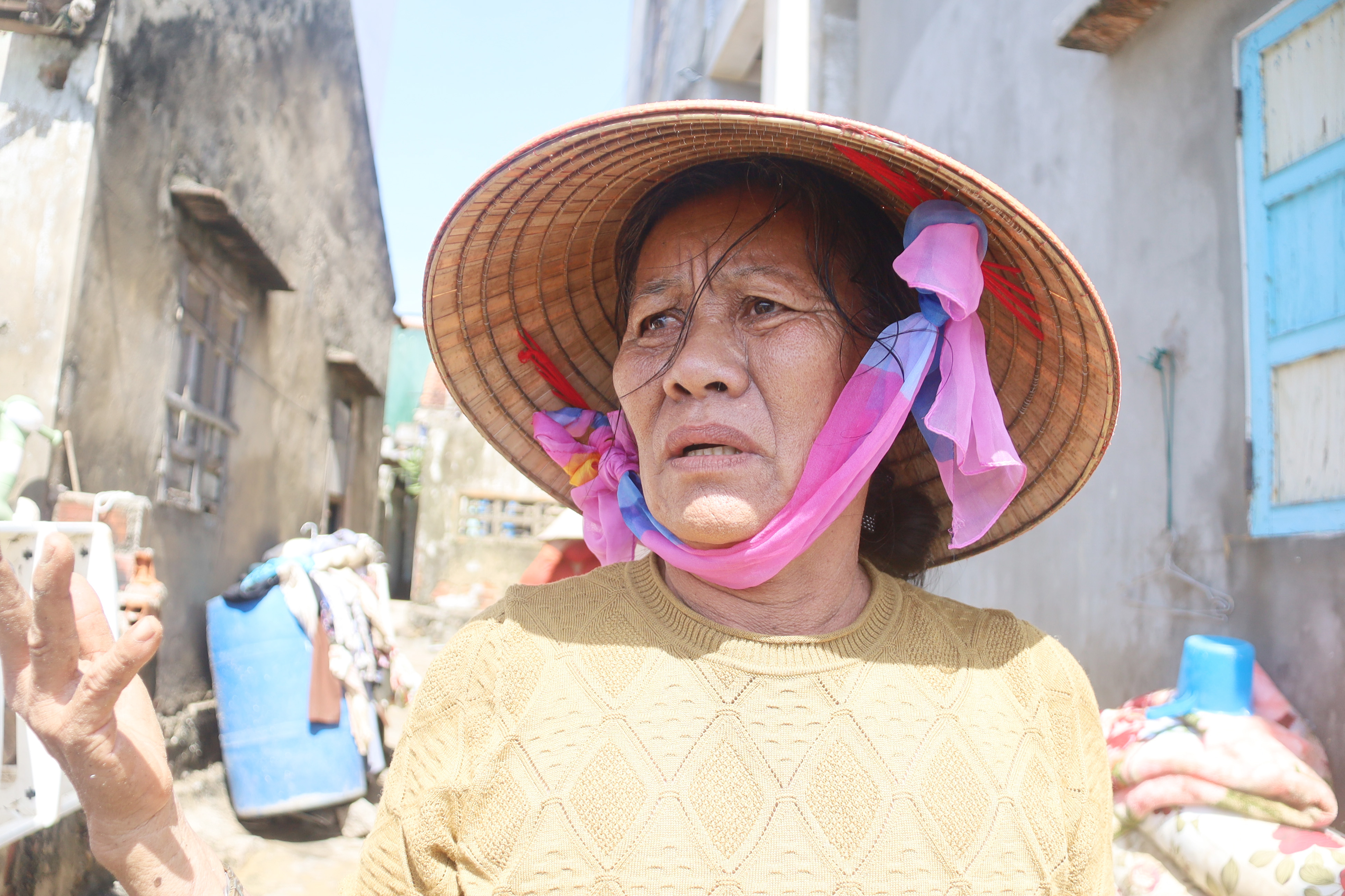 Bà Nguyễn Thị Sáu (63 tuổi, làng biển Lý Chánh) không kìm được nước mắt kể về các thiệt hại, tổn thất của người dân sau bão số 13