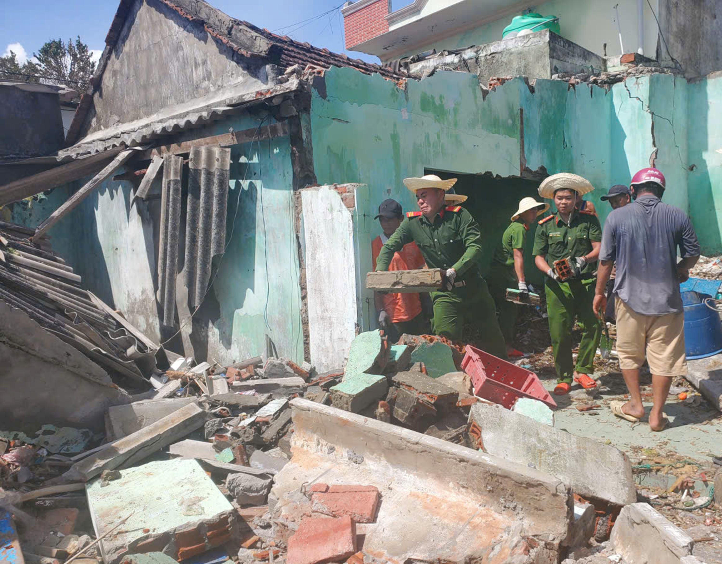Lực lượng công an cùng người dân giúp đỡ một gia đình bị sập hoàn toàn sau bão số 13