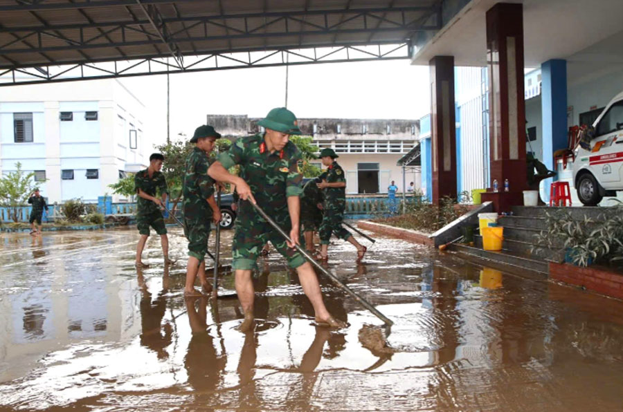 Bộ đội Sư đoàn 315 (Quân khu 5) giúp các trạm y tế, bệnh viện khắc phục hậu quả mưa lũ.