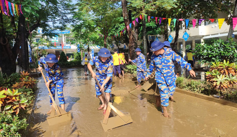 Cán bộ, chiến sĩ Bộ CHQS TP Đà Nẵng giúp Trường Tiểu học Nguyễn Đức Thiệu ở xã Đại Lộc dọn bùn đất.