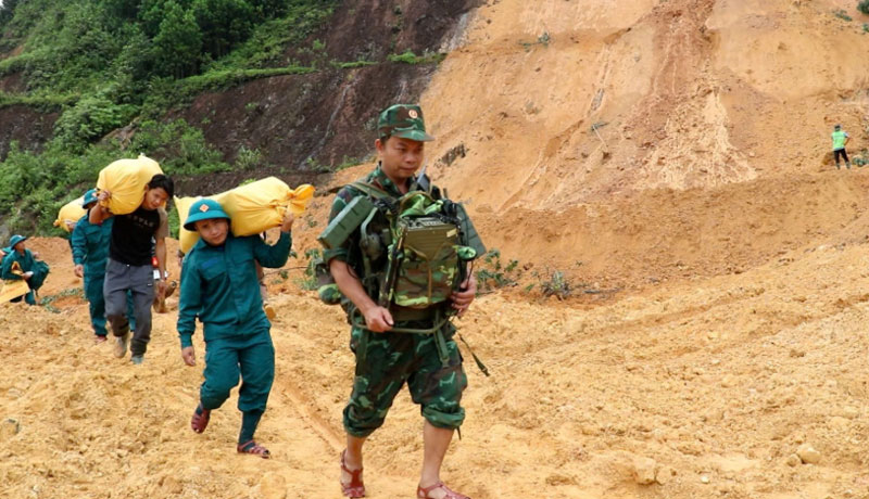 Các lực lượng vận chuyển nhu yếu phẩm hỗ trợ người dân bị cô lập tại xã Trà Tân.