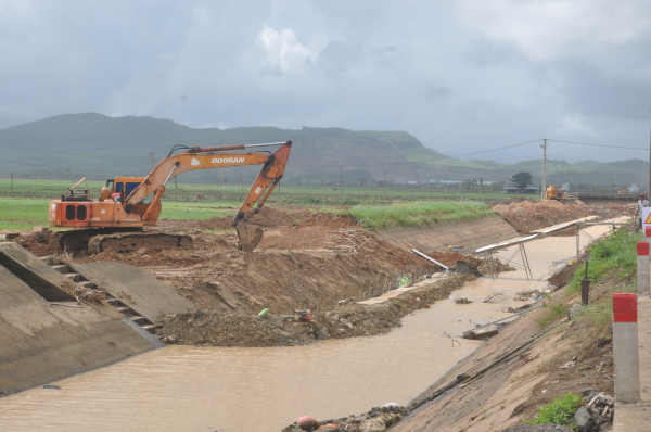 Trên hai tuyến kênh phía Nam và phía Bắc trong hệ thống thủy nông Đồng Cam trong những ngày này, hàng chục xe cơ giới chuyên dụng đào múc đất đã được huy động đến những điểm sạt lở qua địa phận các xã Sơn Thành, Tây Hòa, Phú Hòa 1, phường Phú Yên, phường Đông Hòa tất bật triển khai các thao tác kỹ thuật thi công đắp lại bờ kênh mương đã bị lũ cuốn trôi. Trên quốc lộ 25 và 29 nằm ven hai tuyến kênh, những chuyến xe tải khẩn trương vận chuyển cát, đá, xi măng cung cấp cho các đội thi công xây lắp tiến hành gia cố bờ kênh bằng bê tông.