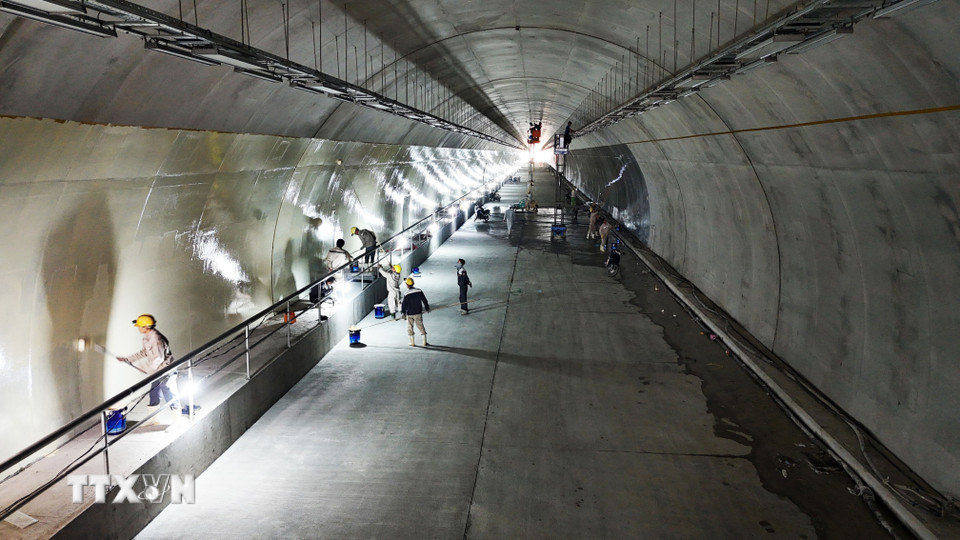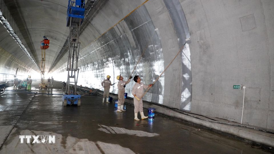 Công nhân thi công hạng mục sơn lòng hầm. (Ảnh: Hữu Quyết/TTXVN)