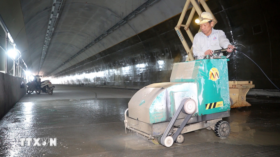 Công nhân thi công hạng mục tạo độ nhám cho mặt đường bên trong hầm. (Ảnh: Hữu Quyết/TTXVN)