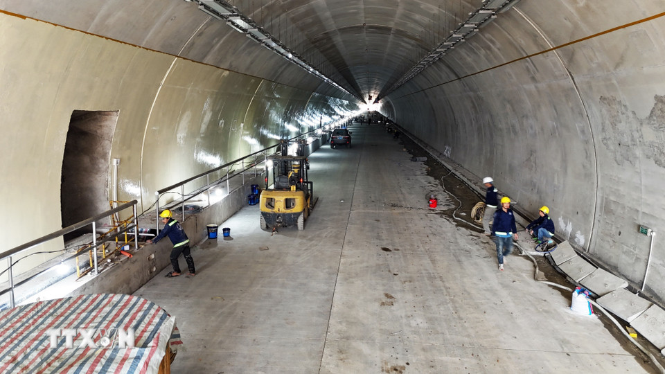 Công nhân và các phương tiện, máy móc thi công các hạng mục kỹ thuật cuối cùng bên trong ống hầm. (Ảnh: Hữu Quyết/TTXVN)