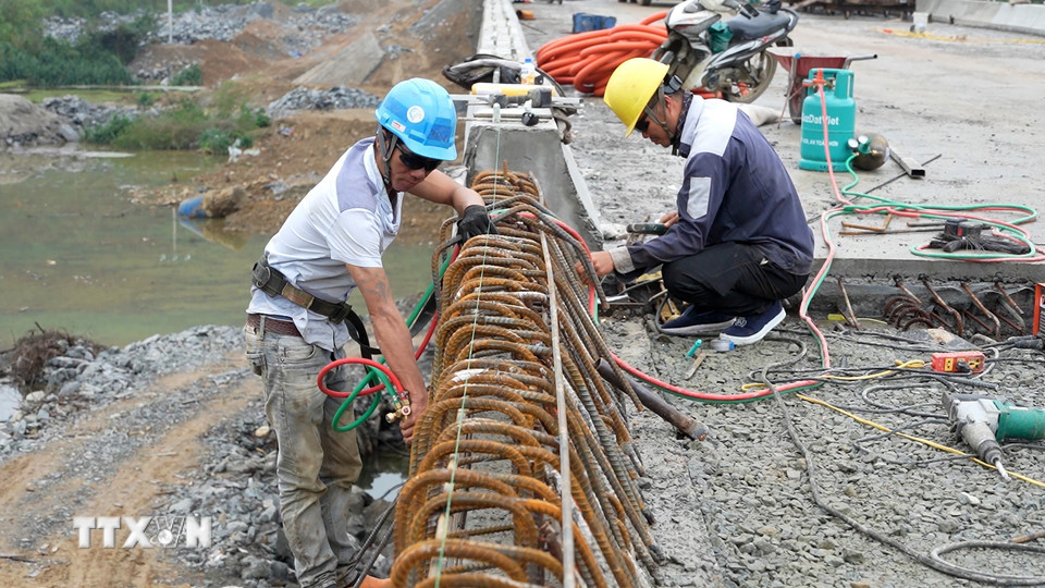 Công nhân thi công hạng mục lan can cầu dẫn vào hầm. (Ảnh: Hữu Quyết/TTXVN)