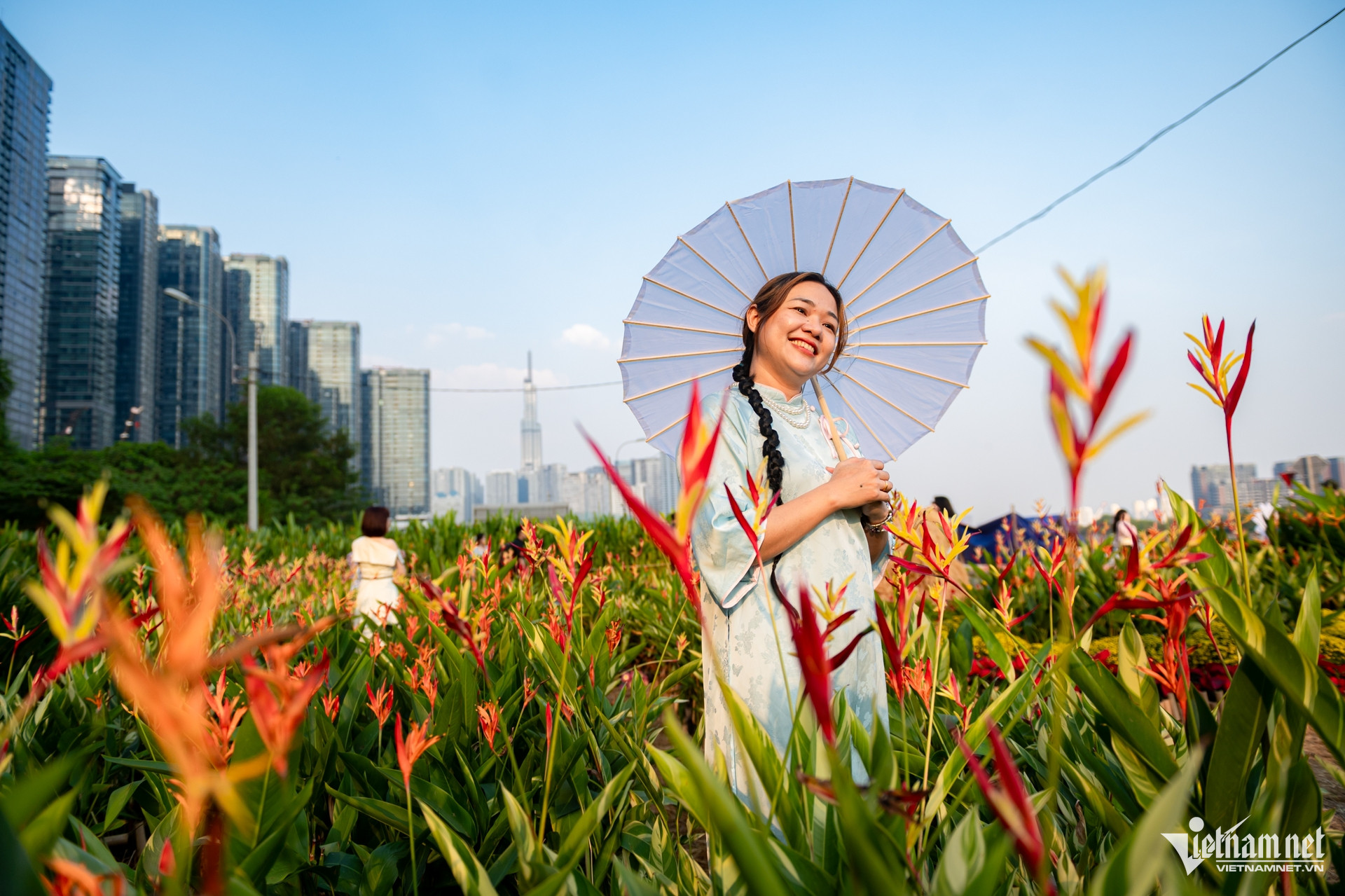 Những ngày cuối tuần, người dân TPHCM và du khách nô nức diện áo dài, vui chơi chụp ảnh tại vườn hoa rộng khoảng 1.000m2 nằm cạnh ga ngầm metro Ba Son.