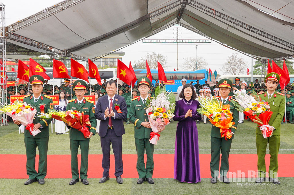*Các đồng chí: Phạm Thị Thu Hằng, Ủy viên Ban Thường vụ Tỉnh ủy, Giám đốc Báo và phát thanh, truyền hình Ninh Bình; Mai Thanh Long; Tỉnh ủy viên, Phó Chủ tịch HĐND tỉnh dự lễ giao quân tại tại điểm giao, nhận quân số 9 (sân vận động xã Xuân Trường).