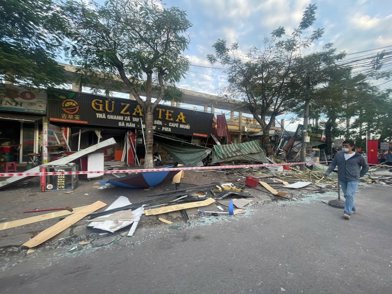 Vụ nổ khiến quán ăn trên bị hư hỏng, kéo theo 2 quán trà sữa, ăn vặt bên cạnh cũng bị hư hại.