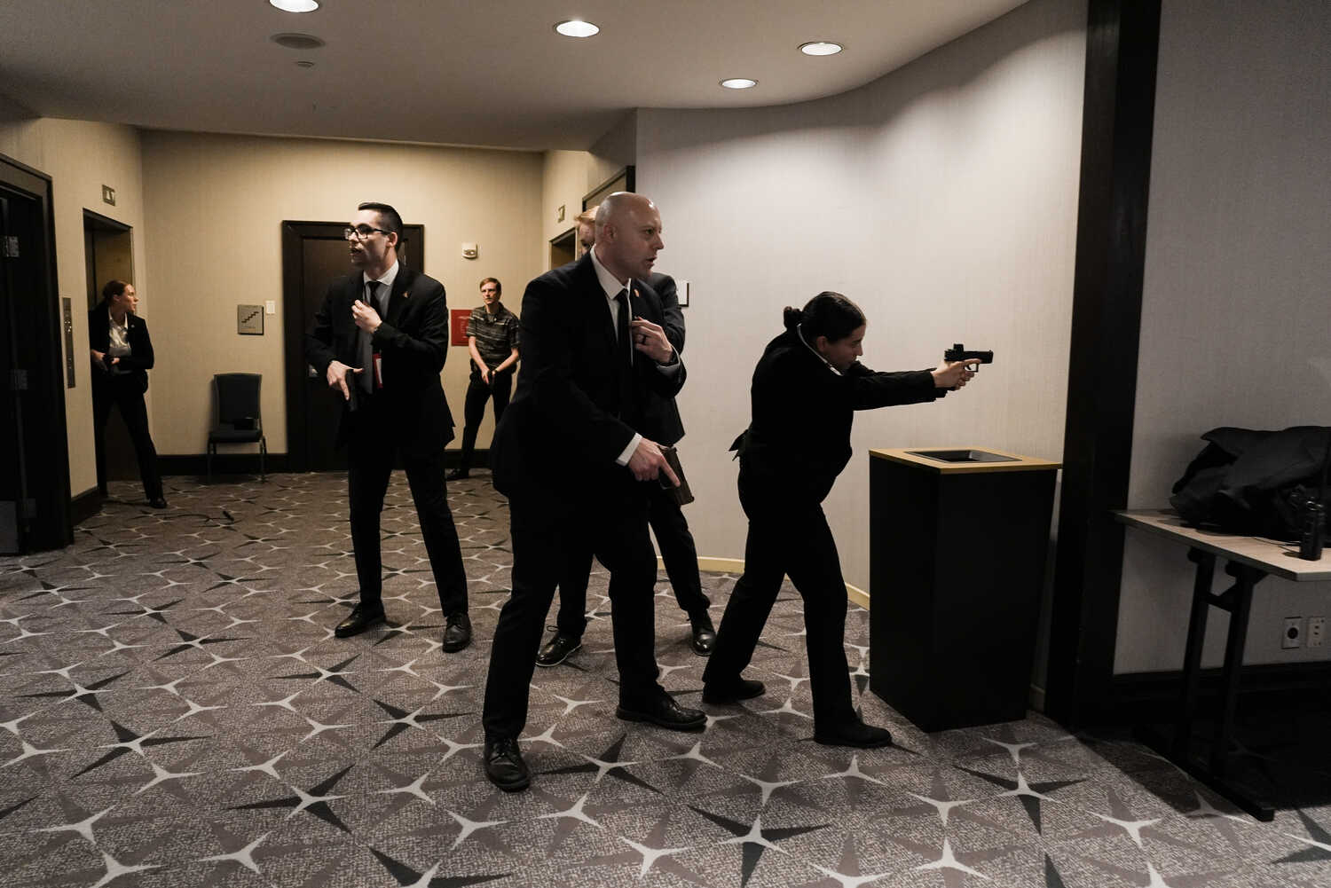 Mật vụ và các lực lượng chức năng nhanh chóng tràn vào phòng tiệc, trong khi hàng trăm người cúi rạp xuống dưới bàn.