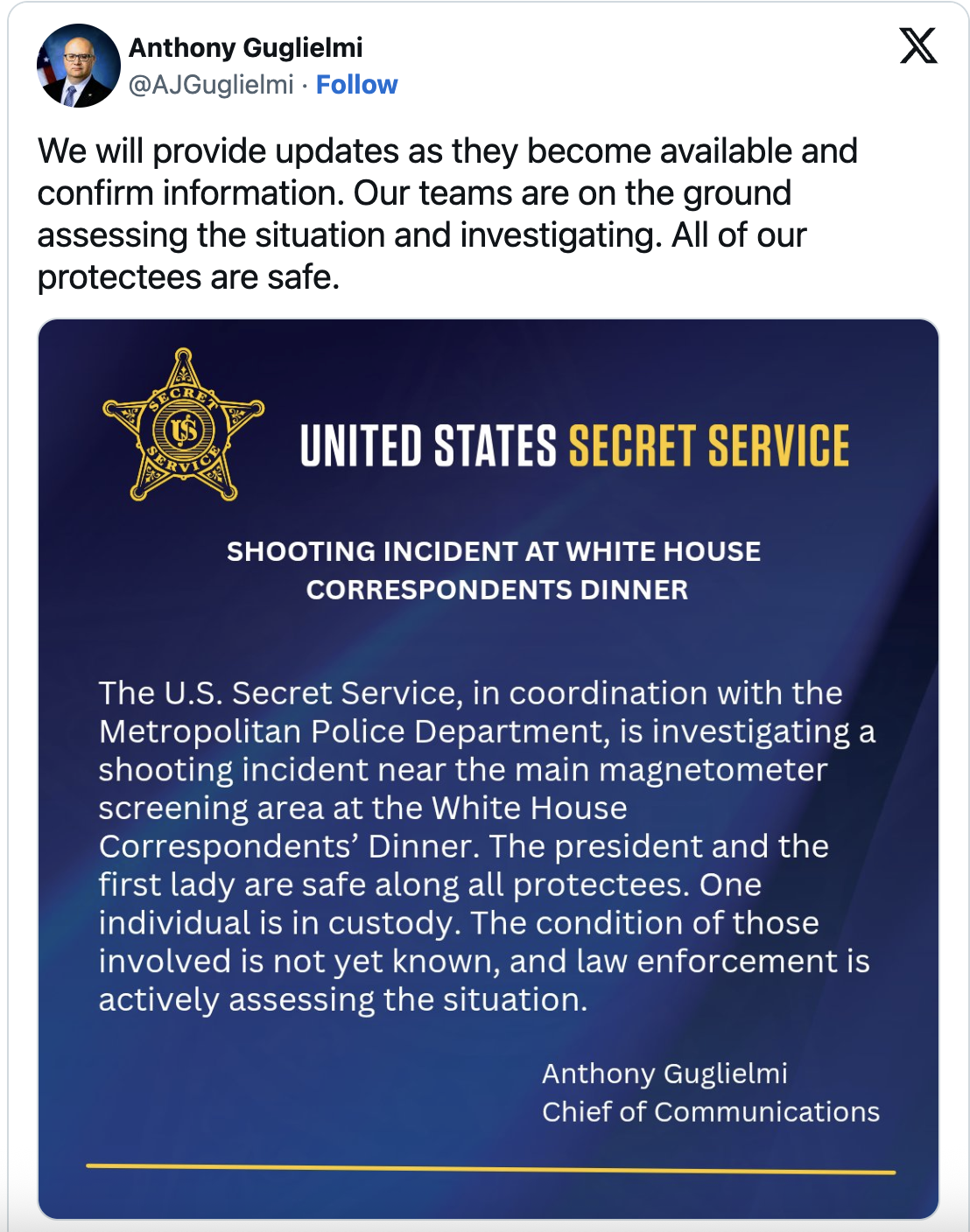 Ông Anthony Guglielmi, người phát ngôn Mật vụ Mỹ xác nhận tình trạng của ông Trump sau khi xảy ra vụ nổ súng. "Tổng thống và Đệ nhất phu nhân cùng tất cả những người được bảo vệ đều an toàn", thông báo đề cập.