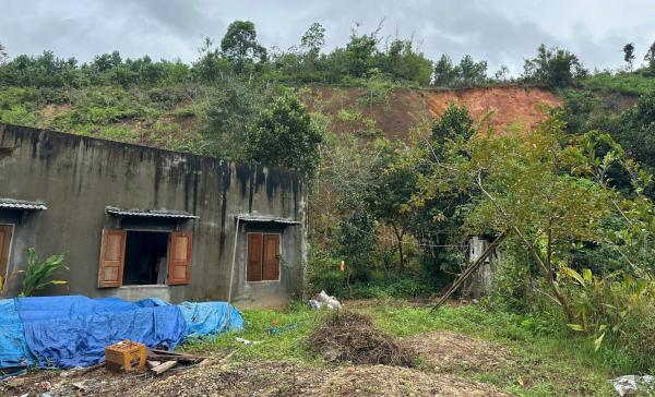 Quả đồi sau nhà ông Vong nguy cơ sạt lở rất cao sau tiếng nổ lớn, ghi nhận có vết nứt, đất sụt trượt.