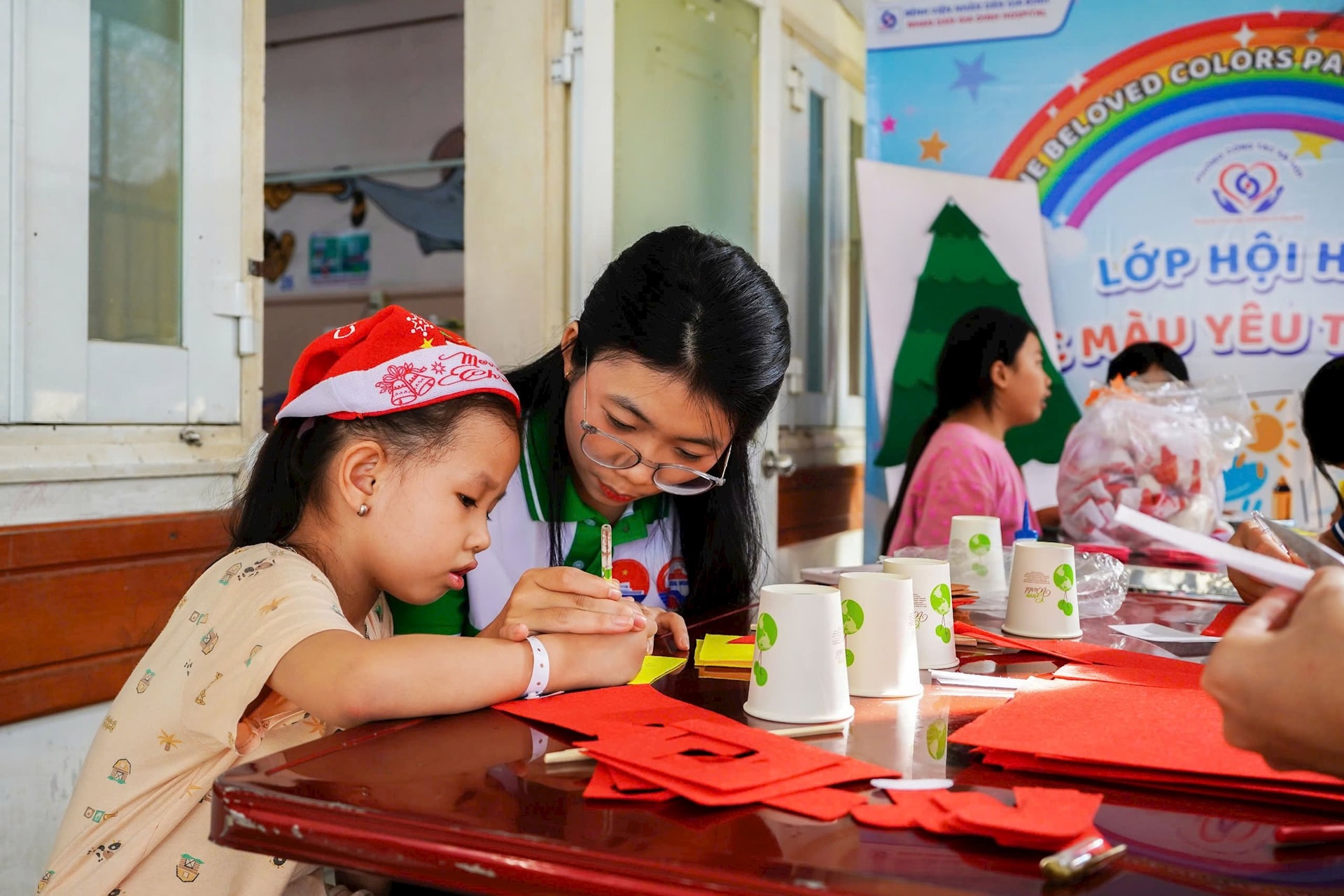 Bên cạnh đó, các em còn sáng tạo thiệp Giáng sinh gửi tặng bệnh nhân Khoa Ung bướu. Những tấm thiệp rực rỡ sắc màu, chứa đựng lời chúc chân thành, sẽ được treo trên cây thông Noel trước sảnh như những lời ước nguyện an lành.