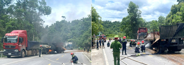 Cảnh sát cứu hộ vụ TNGT giữa xe "hai khúc" gắn biển số Lào với xe đầu kéo gây ra vụ cháy trên Quốc lộ 8A.