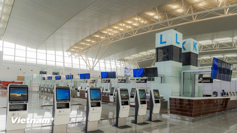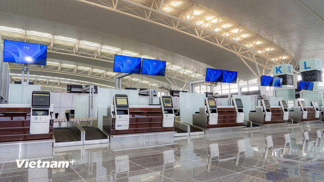Khu vực sảnh đi đã lắp đặt hệ thống 24 Kiosk check-in giúp khách tự làm thủ tục không cần xếp hàng vào quầy và 24 quầy tự gửi hành lý. (Ảnh: Việt Hùng/Vietnam+)