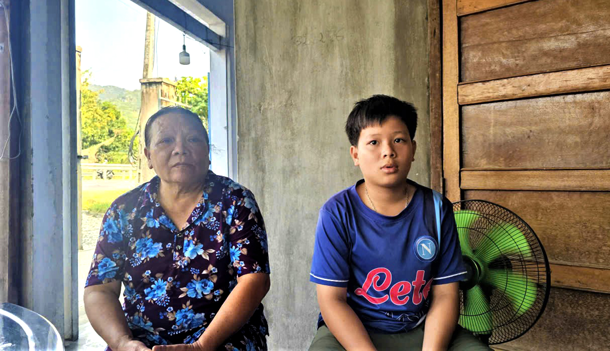 Trong căn nhà nhỏ, bà Bùi Thị Sen (59 tuổi) đang ngồi trước hiên. Nghe bà gọi, mãi sau đó, Nguyễn Phước Khang (13 tuổi) mới rụt rè bước ra. Khang ngồi sát bên bà ngoại, đôi tay đan vào nhau, ánh mắt thỉnh thoảng lại hướng ra con đường đông xe phía trước.